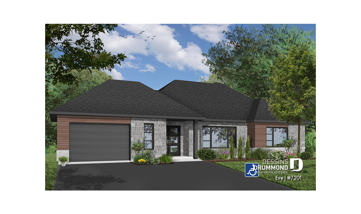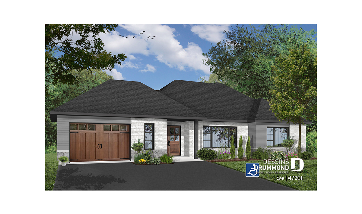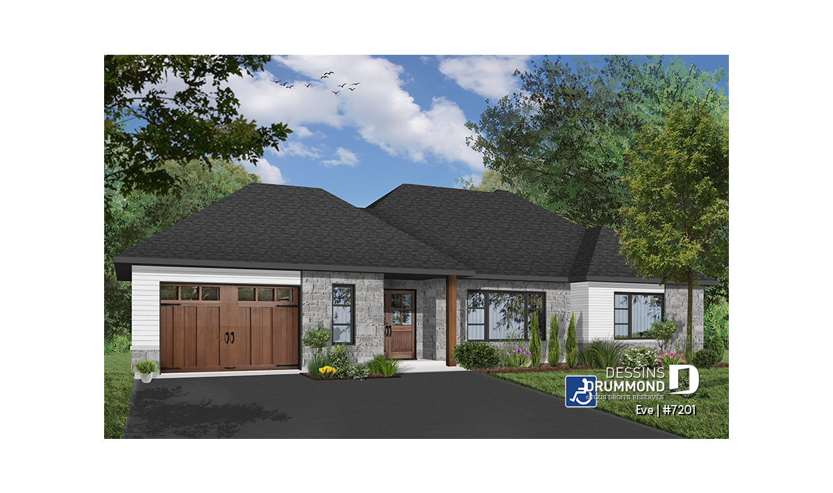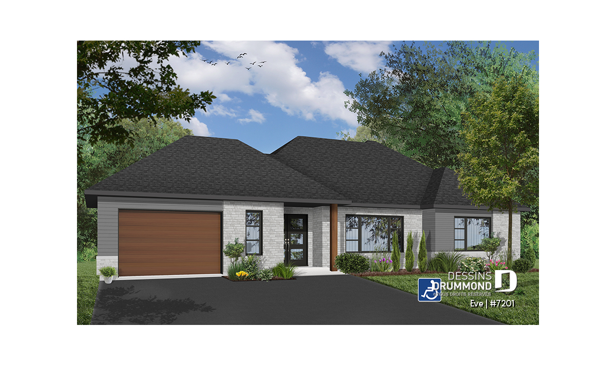 Le plan Ève (#7201) est un modèle de maison plain-pied contemporain soigneusement conçu pour offrir une accessibilité complète aux personnes en fauteuil roulant ou à mobilité réduite, sans compromis sur le style, le confort ni la qualité de vie. Ce bungalow moderne avec garage intégré propose un rez-de-chaussée entièrement sans obstacles, favorisant une circulation fluide et sécuritaire dans l’ensemble de la maison.