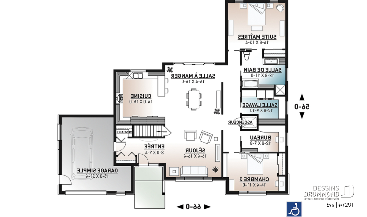 Le plan Ève (#7201) illustre parfaitement une approche réfléchie de l’architecture résidentielle accessible, axée sur l’autonomie, le confort et l’adaptabilité à long terme.