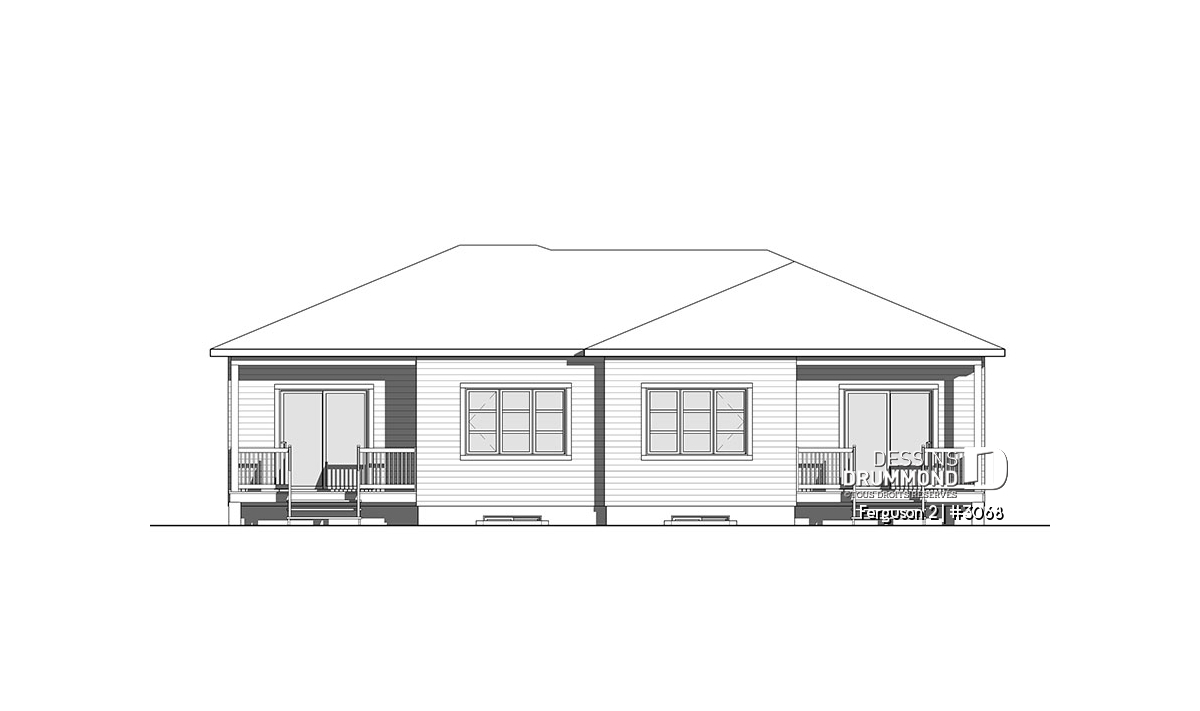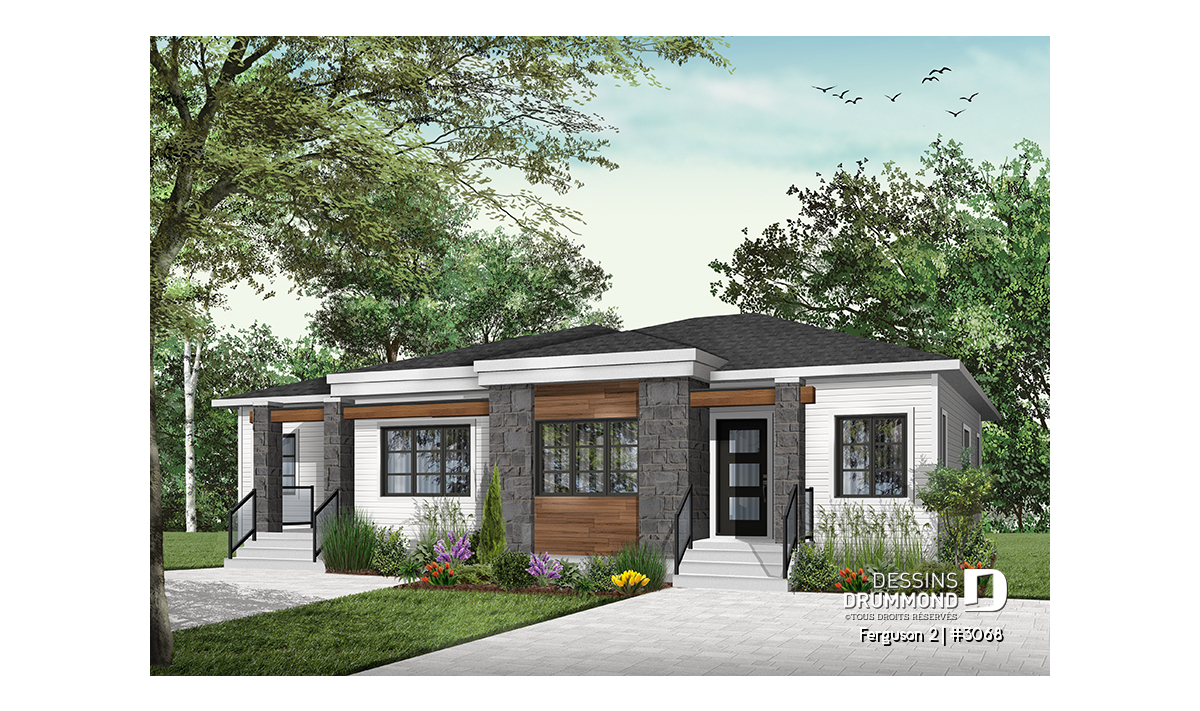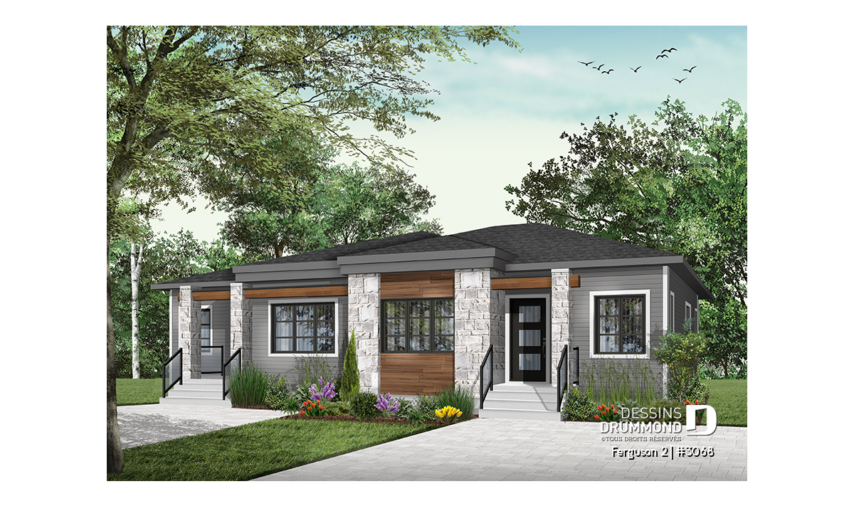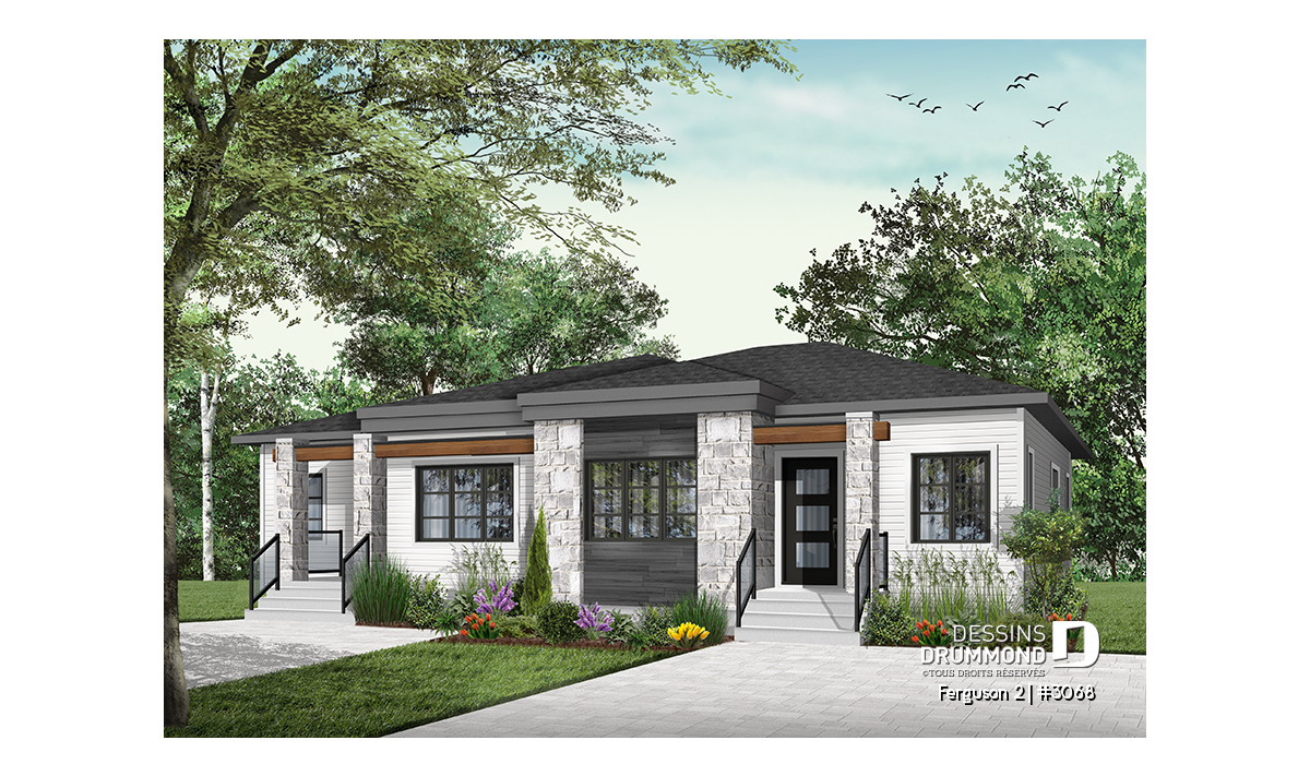 Voici un modèle de jumelé de style contemporain, le nouveau plan # 3068 de Dessins Drummond, vous offrant de beaux espaces et un potentiel au sous-sol pour le futur! Le modèle Ferguson 2, qui est un dérivé du plan # 3067, propose un sous-sol à aménager et une seule salle de bain au rez-de-chaussée au lieu de deux comme son modèle de base. Cette version # 3068 du modèle de base a été pensée pour un couple ou famille souhaitant utiliser l’espace du sous-sol afin d’ajouter des chambres ou une salle familiale. Il est à noter que le plafond du rez-de-chaussée est à 9 pieds partout, ce qui donne une amplitude non négligeable aux pièces.