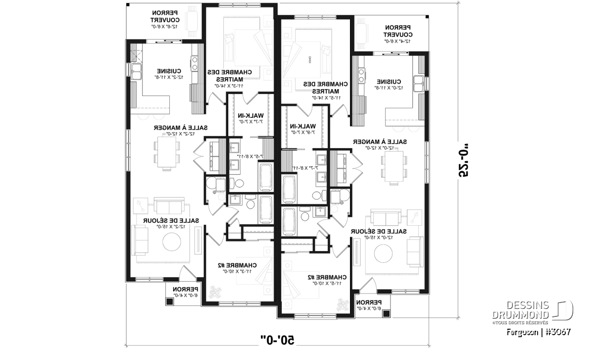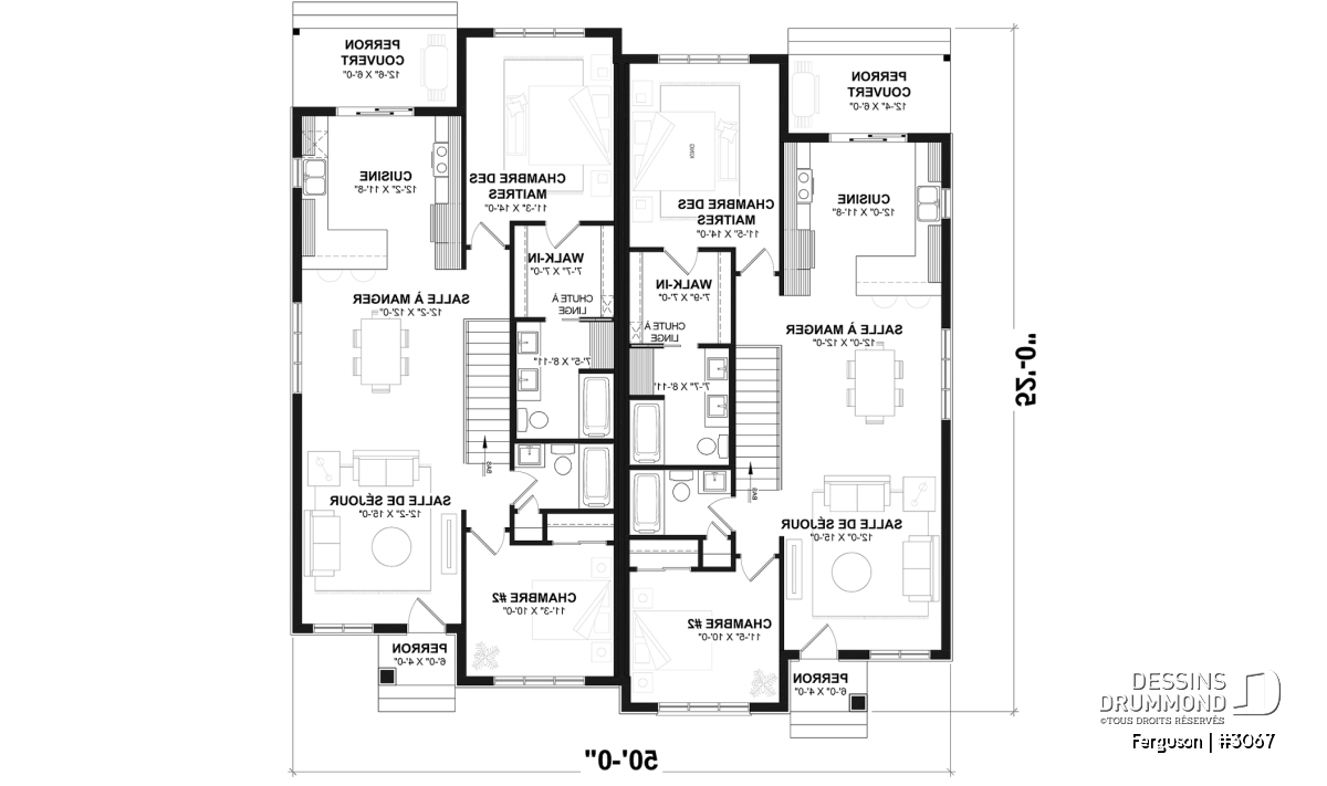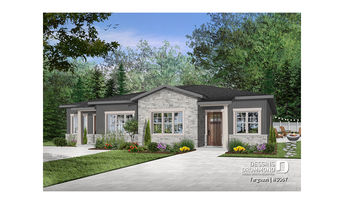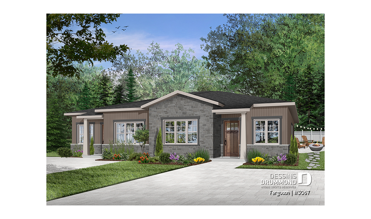Voici un modèle de jumelé de style américain, le plan FERGUSON # 3067 de Dessins Drummond, vous offrant de beaux espaces et du confort! Le modèle Ferguson a été pensé initialement pour un couple ou famille souhaitant ne pas avoir de sous-sol ce qui nous permet de récupérer l’espace prévu pour un escalier (menant au sous-sol) et d’ainsi maximiser le pied carré global. Il est à noter que le plafond du rez-de-chaussée est à 9 pieds partout, ce qui donne une amplitude non négligeable aux pièces. Une option avec sous-sol à aménager est cependant disponible ($).