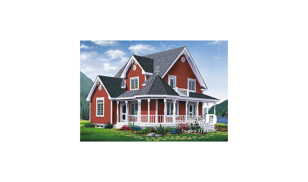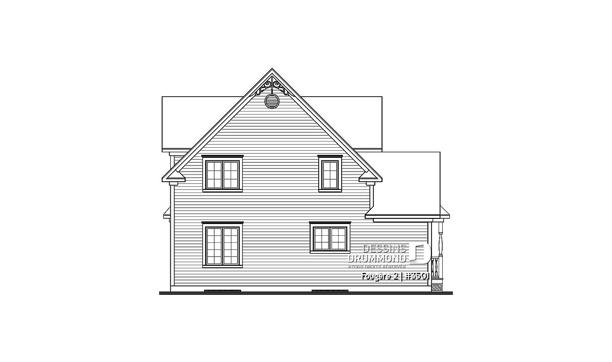 Habillé de déclin champêtre sur l’ensemble de ses façades, de colonnes et barreaux tournés et de quelques moulures aux pignons, ce modèle aux influences loyalistes se prête parfaitement bien à la construction en campagne ou, si vous préférez, sur de grands espaces.