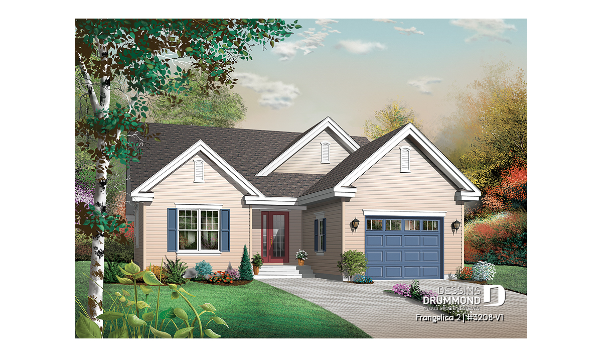 Vue avant - MODÈLE DE BASE - Plan de maison 1 étage, 3 chambres, garage, grande salle familiale, coin ordinateur, style Cape Cod, foyer - Frangelica 2
