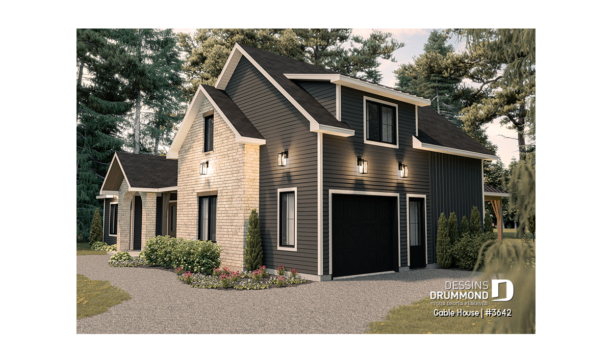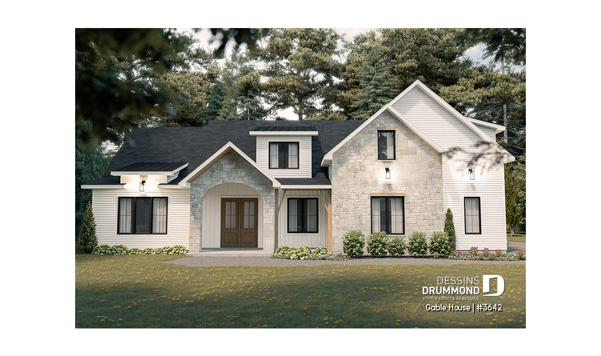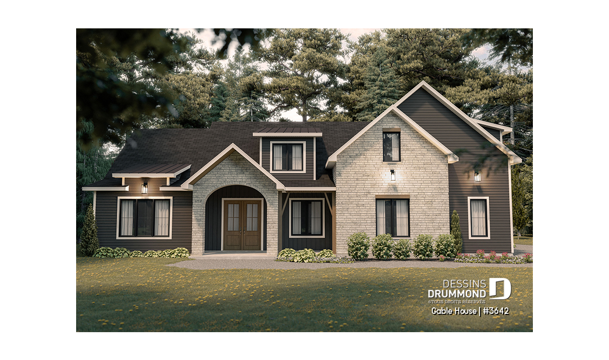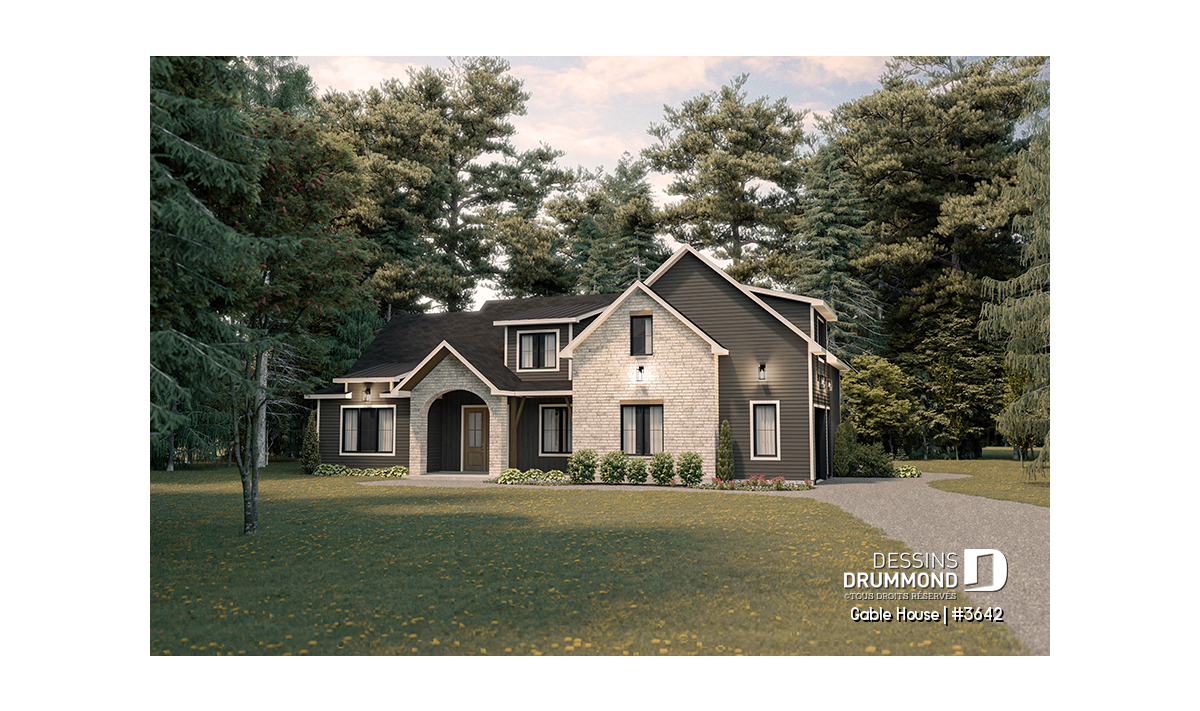 Le plan de maison GABLE HOUSE (plan no. 3642), de style Français moderne, propose 2660 pieds carrés de surface aménagés sur deux planchers. Tous les plafonds sont à 9' au rez-de-chaussée sauf à la salle à dîner et salle de séjour qui ont un plafond cathédrale à 12’9’’. La fondation initiale prévue est sur dalle, cependant plusieurs autres options de fondation sont disponibles ($) si vous souhaitez un sous-sol. Un garage de 485 pieds carrés est aussi aménagé, incluant un pratique rangement et ainsi qu'une pièce mécanique.