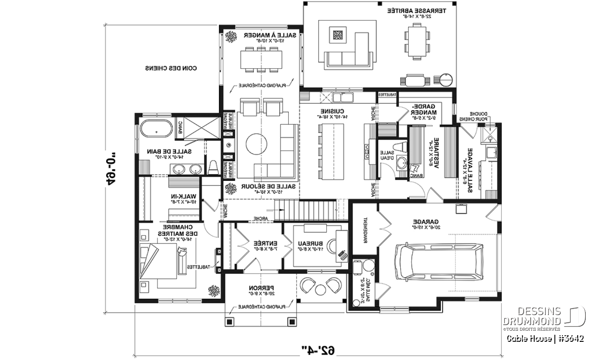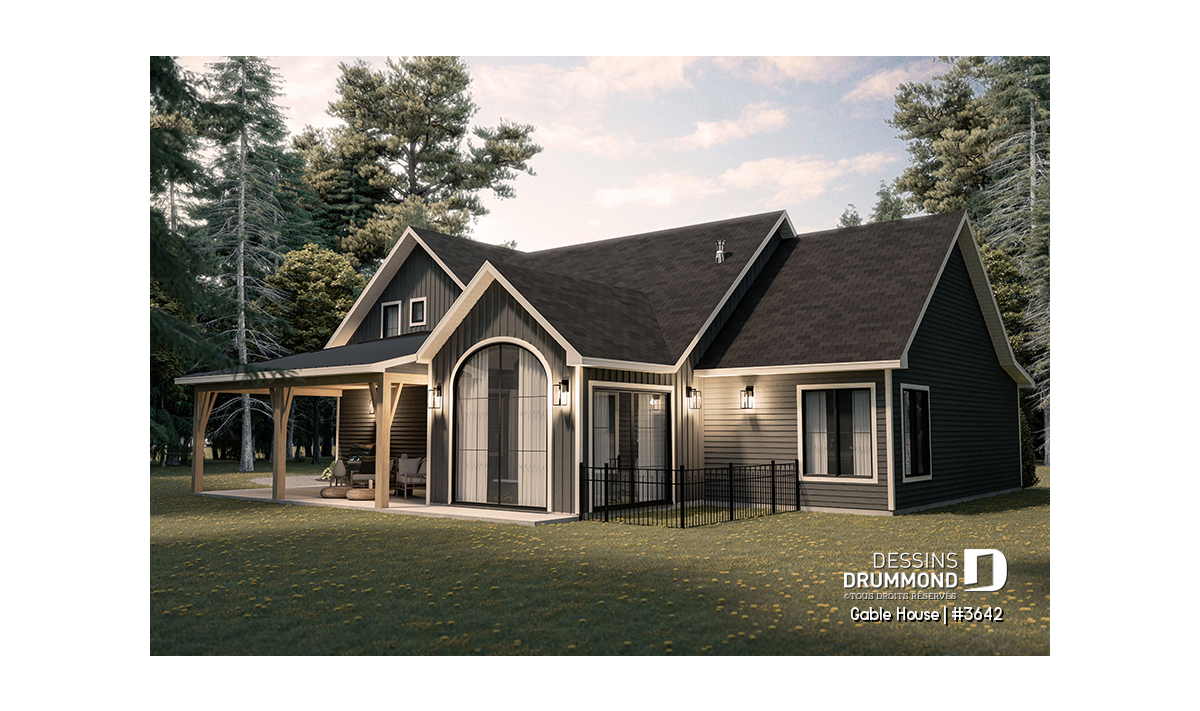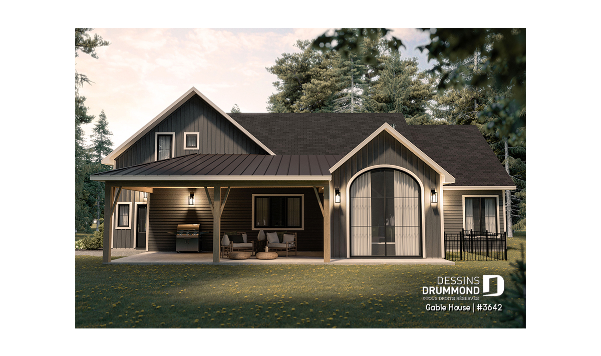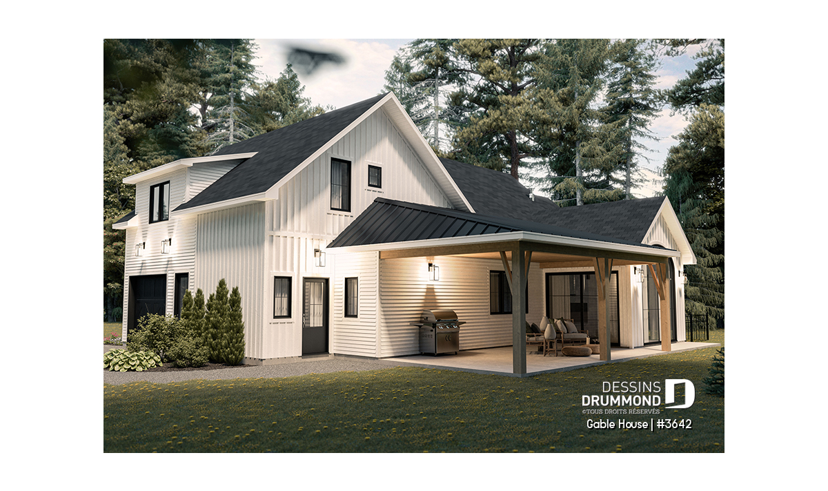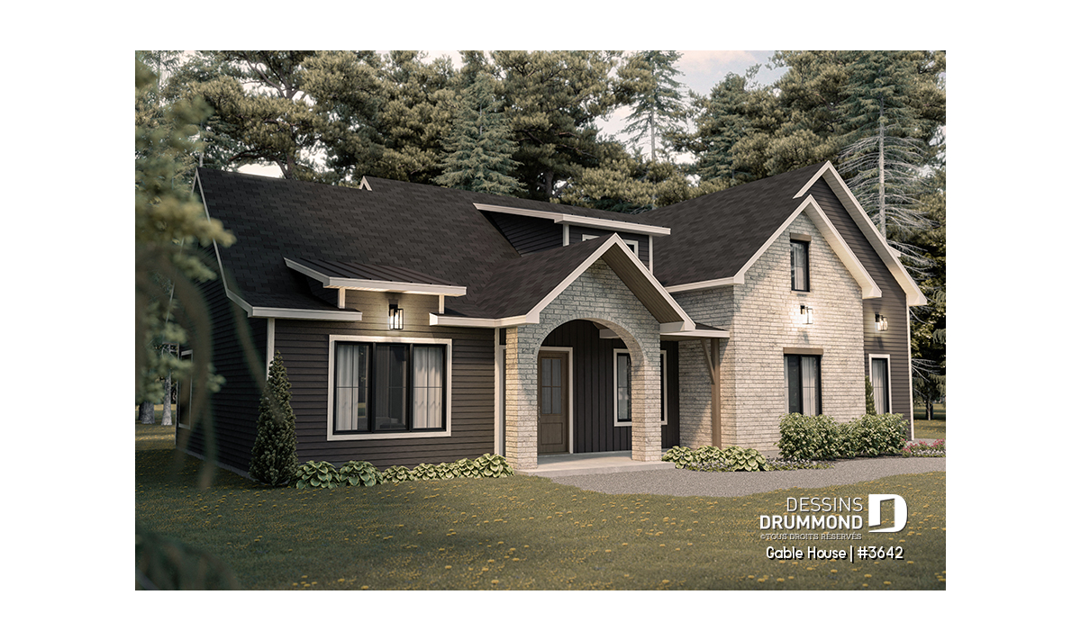 Le plan de maison GABLE HOUSE (plan no. 3642), de style Français moderne, propose 2660 pieds carrés de surface aménagés sur deux planchers. Tous les plafonds sont à 9' au rez-de-chaussée sauf à la salle à dîner et salle de séjour qui ont un plafond cathédrale à 12’9’’. La fondation initiale prévue est sur dalle, cependant plusieurs autres options de fondation sont disponibles ($) si vous souhaitez un sous-sol. Un garage de 485 pieds carrés est aussi aménagé, incluant un pratique rangement et ainsi qu'une pièce mécanique.