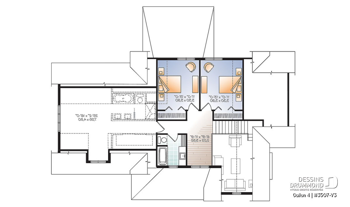 L’étage, pour sa part, n’est pas en reste avec sa mezzanine, ses deux chambres secondaires de bien beau format, sa salle de bain et son vaste espace boni aménageable en salle familiale ou bien, comme signalé ici en pointillé, en suite d’invités que ceux-ci sauront certainement apprécier.