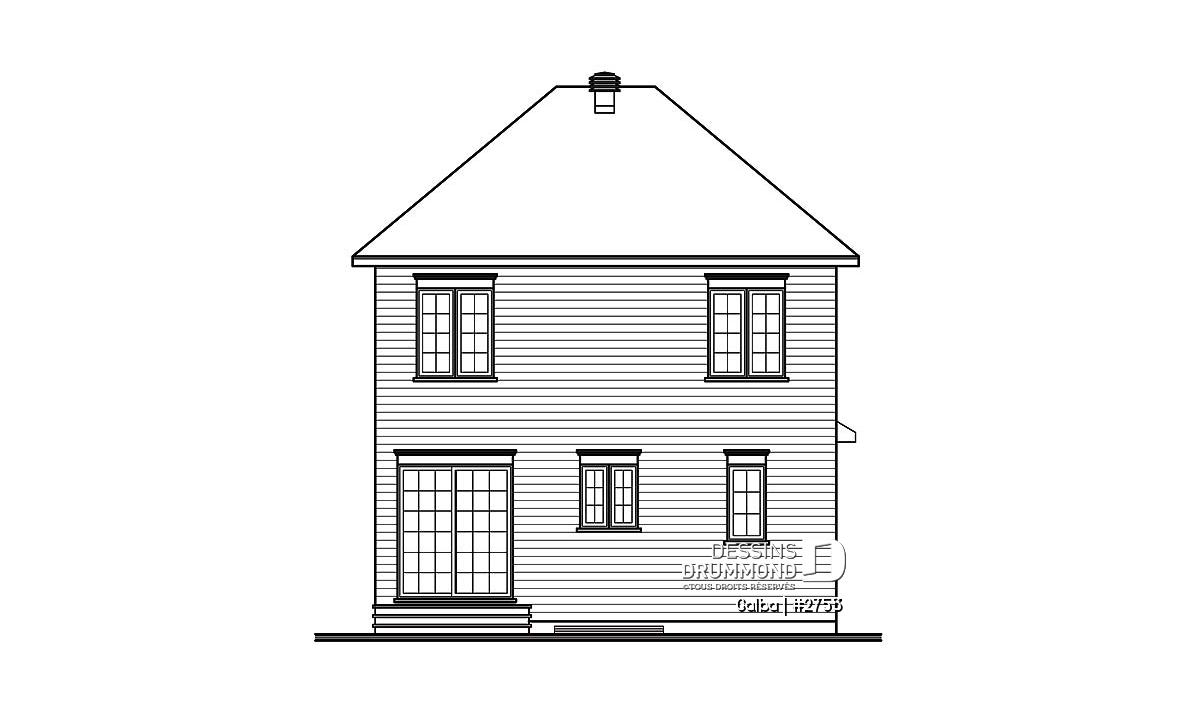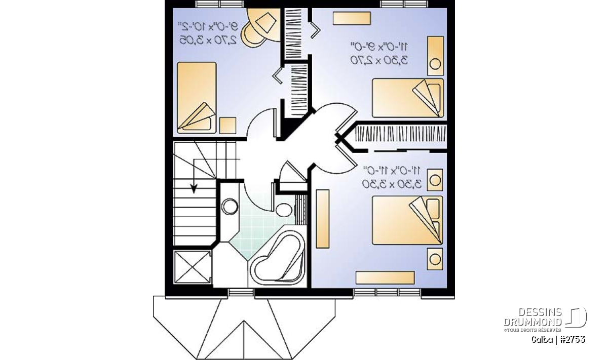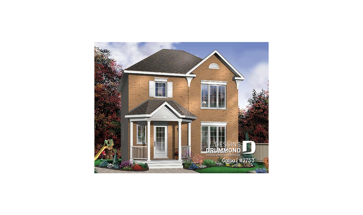 Plan de maison classique à étage, aire ouverte, 3 chambres, fenestration abondante, Européen
