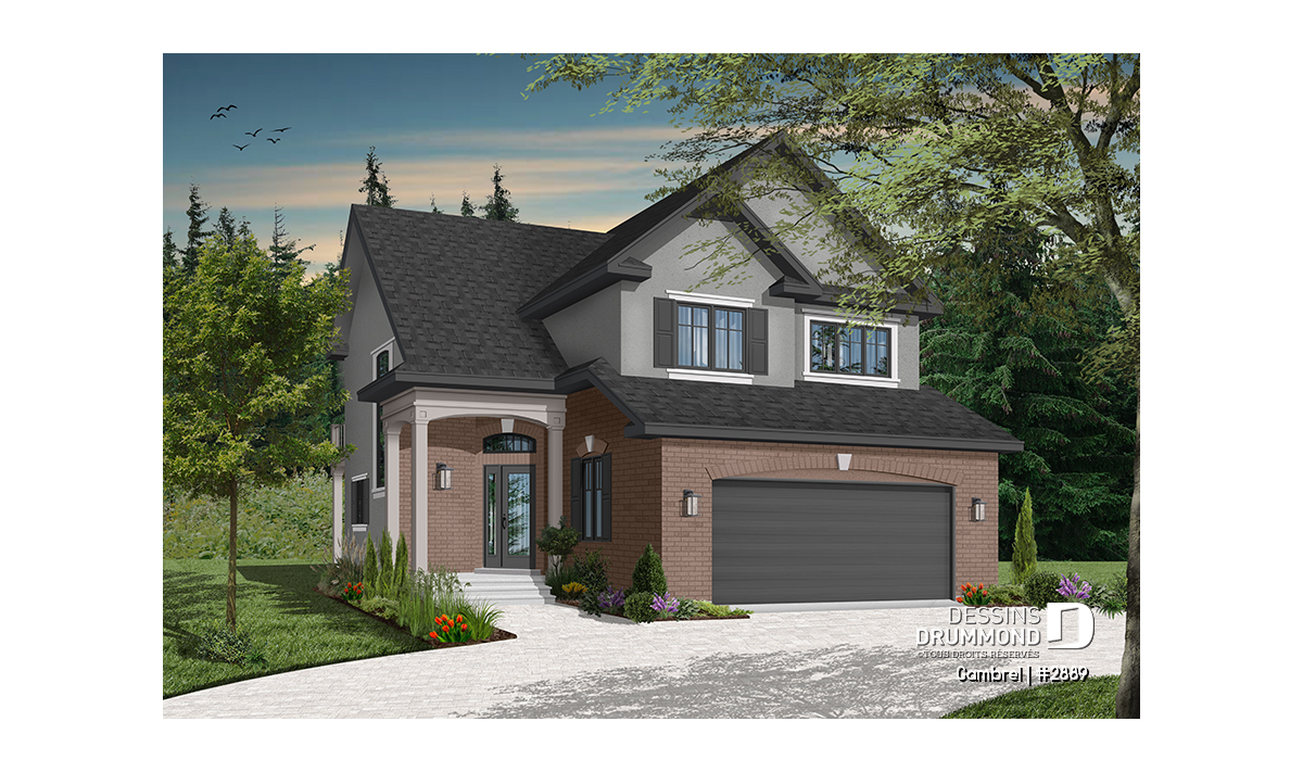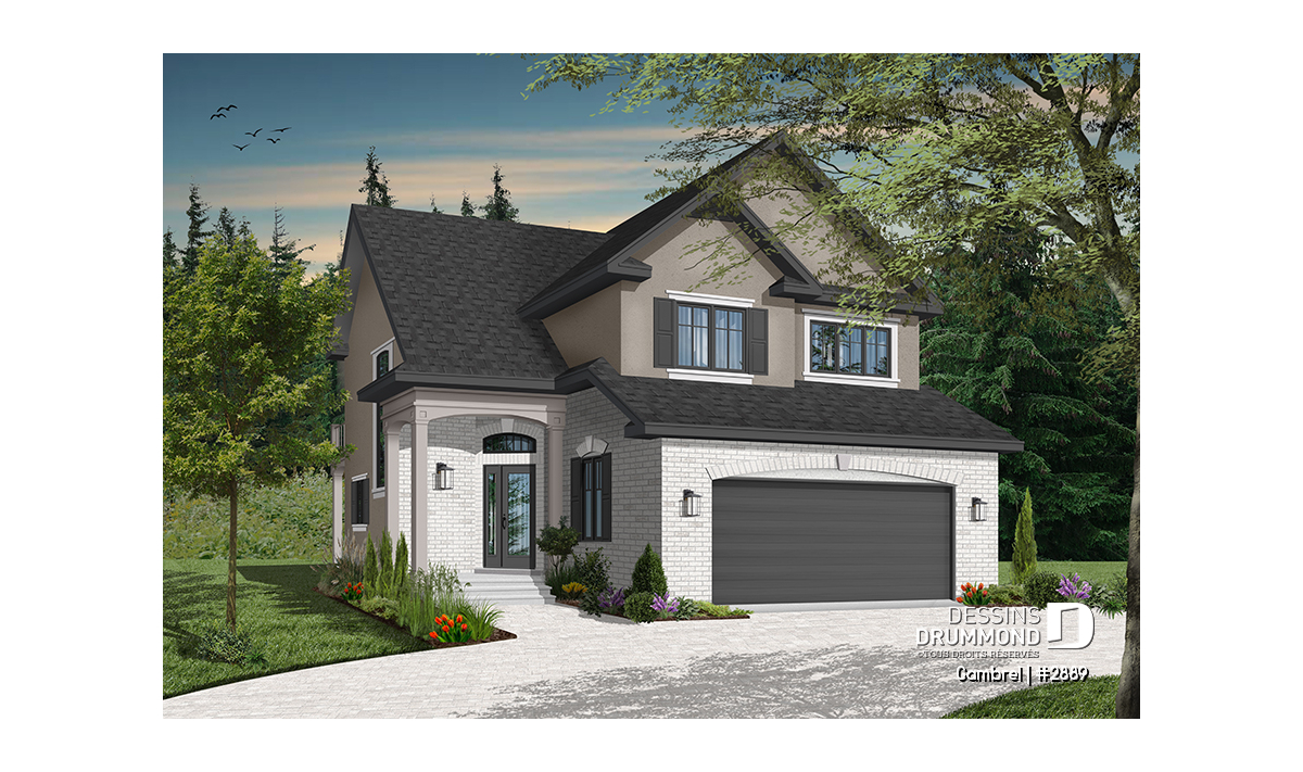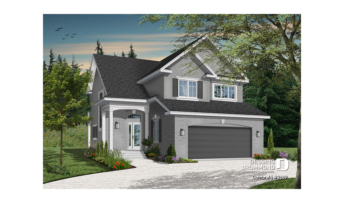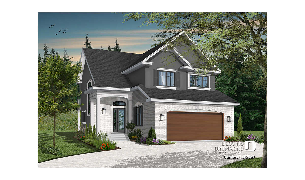 Malgré le fait qu’il suggère un garage double en façade principale et sur seulement 30 pieds de largeur, ce cottage propose tout de même une vue avant à la fois distincte et élégante grâce à ce double volume en pignons au-dessus du garage et à cet abri d’entrée surélevé et donnant une certaine emphase à la maison sur son côté droit.