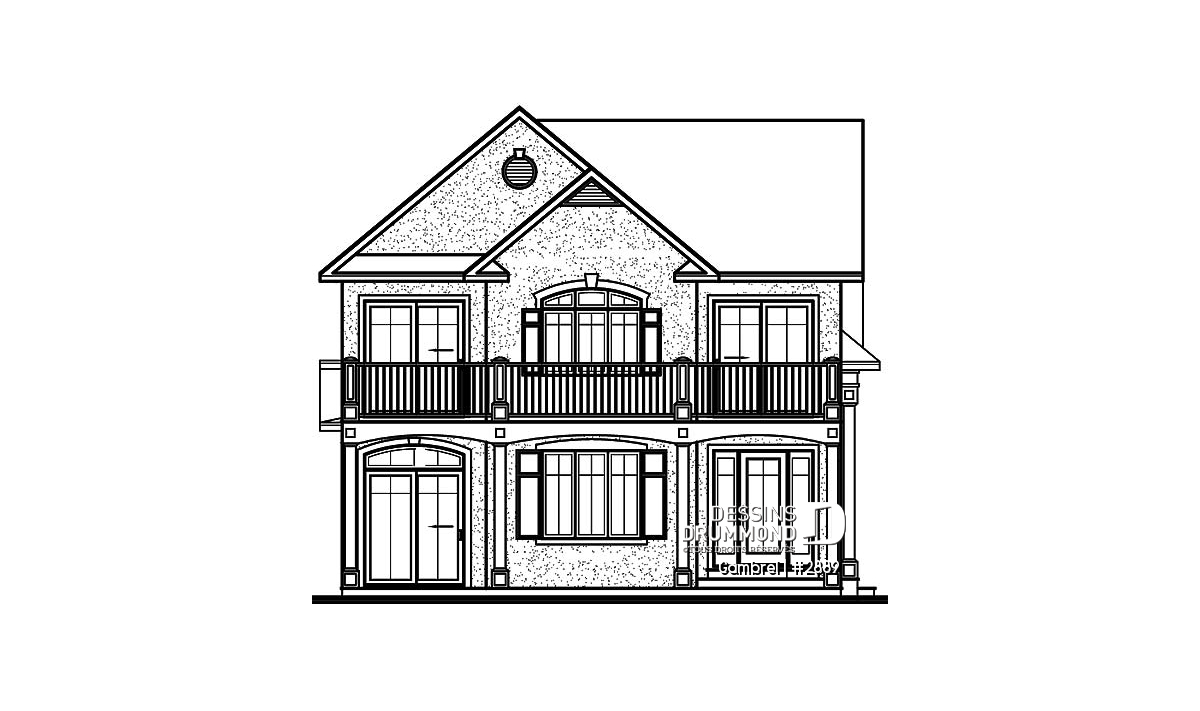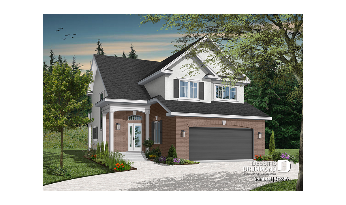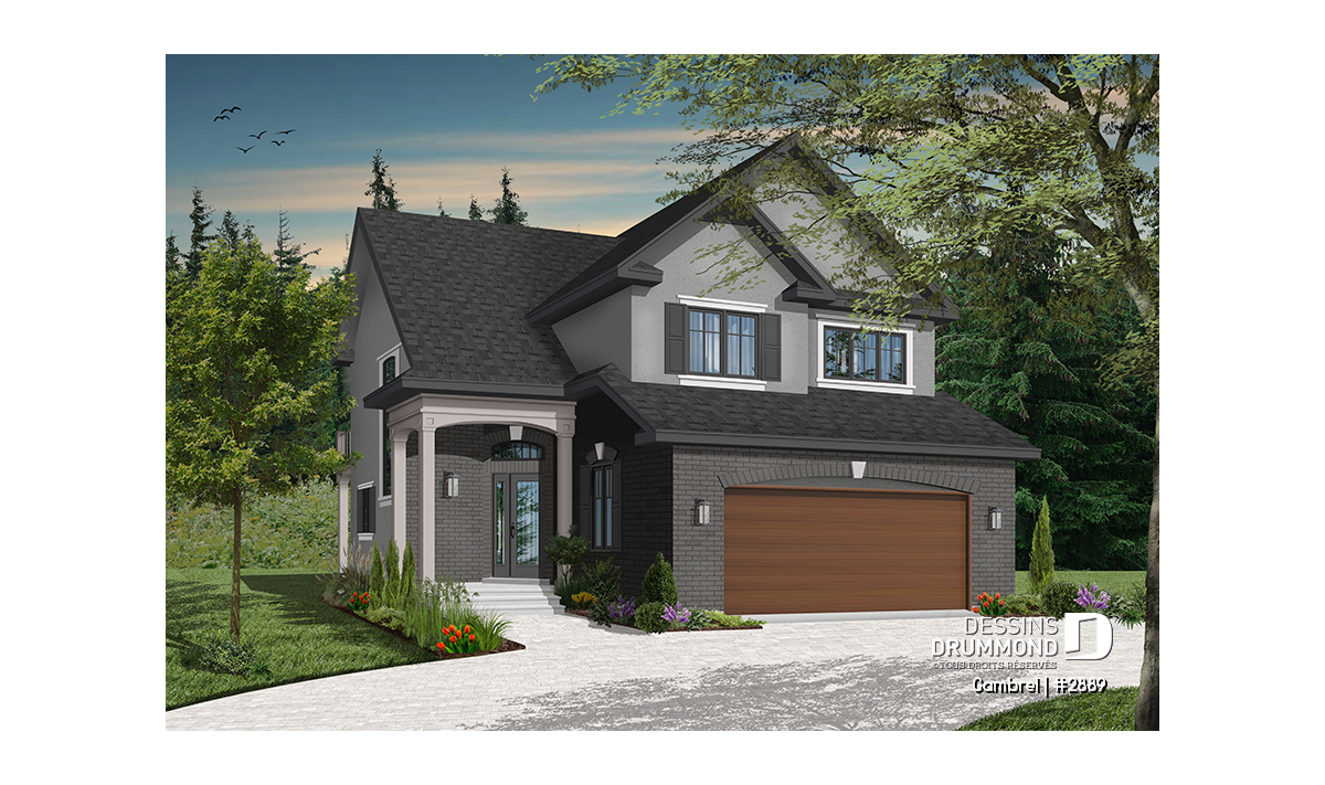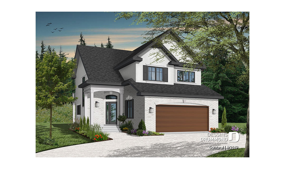 Malgré le fait qu’il suggère un garage double en façade principale et sur seulement 30 pieds de largeur, ce cottage propose tout de même une vue avant à la fois distincte et élégante grâce à ce double volume en pignons au-dessus du garage et à cet abri d’entrée surélevé et donnant une certaine emphase à la maison sur son côté droit.