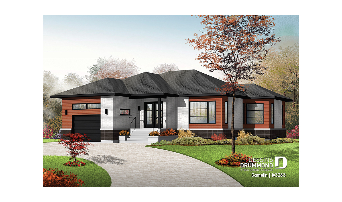 Vue avant - MODÈLE DE BASE - Plan de maison moderne, grand garage, 2 chambres, grand cuisine avec îlot central, buanderie au rdc. - Gamelin
