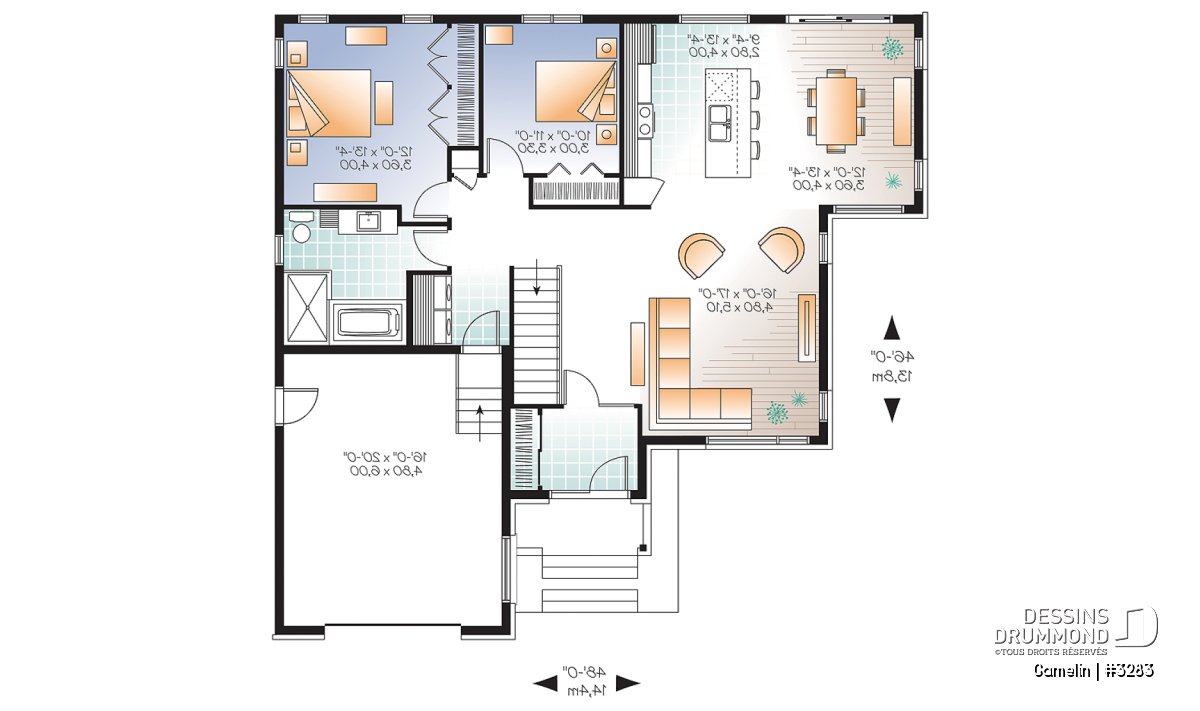 À l’intérieur, on retrouve donc tous les atouts qui ont fait du plan original 3260 un plan tant recherché et ça va comme suit : vestibule et garde-robe de bon format à l’entrée principale, secteur activités ( cuisine-dînette-salle à manger et salle de séjour ) entièrement ouvert et abondamment fenêtré avec îlot-lunch de plus de 3pi x 8pi à la cuisine d’approche résolument contemporaine. Sans oublier, deux belles chambres, une salle de bain fort bien organisée et un coin buanderie tout près de l’entrée de service du garage et au rez-de-chaussée. Ici, la salle de bain suggère une douche indépendante de 3pi x 5pi à la fois vitrée et attenante au bain.