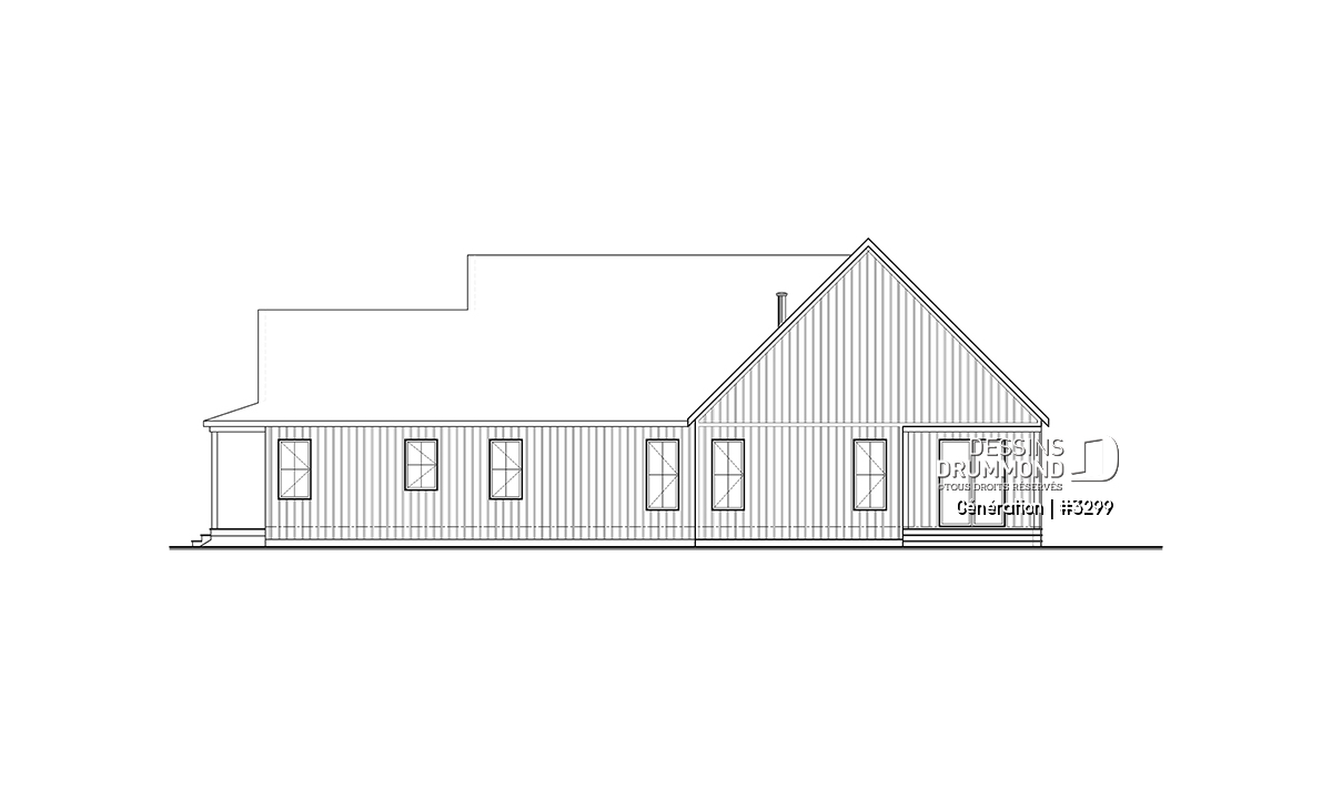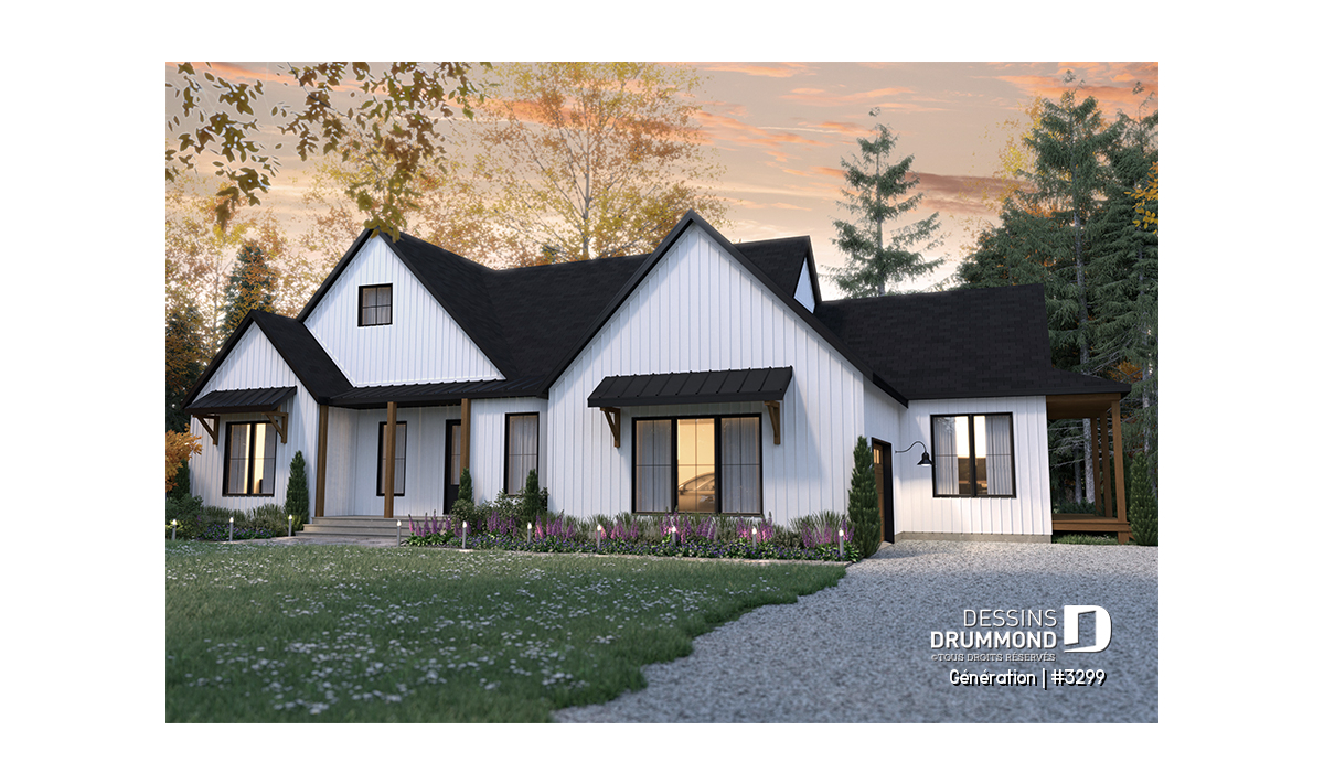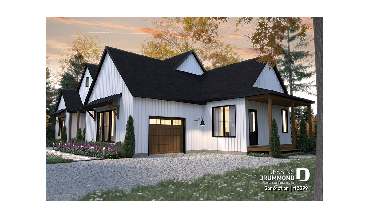 Plan de maison bigénération de style Farmhouse moderne, très tendance, avec plafond à 9' partout.