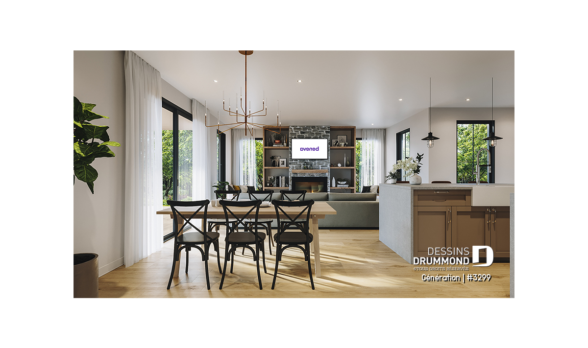 Le salon possède un foyer et de l'espace pour installer des tablettes de chaque côté. Plusieurs fenêtres y sont aménagés amenant ainsi une belle lumière naturelle à cet espace. De plus, le salon offre aussi un accès à la terrasse privée et abritée via des portes-patio ou portes jardin, à la convenance des propriétaires.