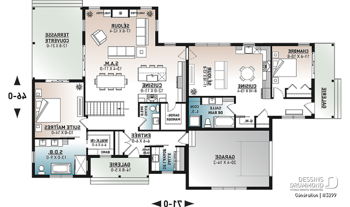 Le plan de maison bi-génération GÉNÉRATION (#3299) a 1306 pi.ca au logement principal (à droite) et 680 pi.ca. au logement secondaire (à gauche). Les espaces extérieurs des deux logements sont à l'opposé l'un de l'autre permettant ainsi aux occupants de vivre une intimité au quotidien.