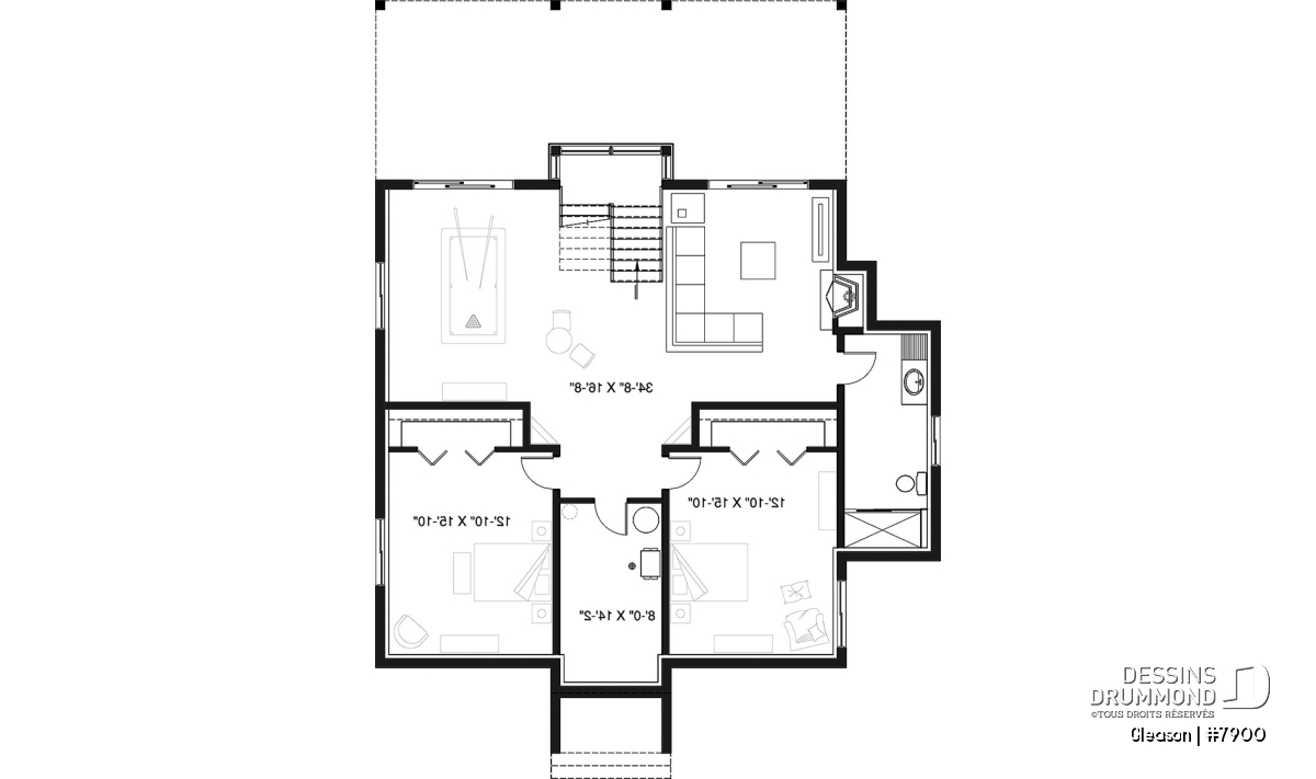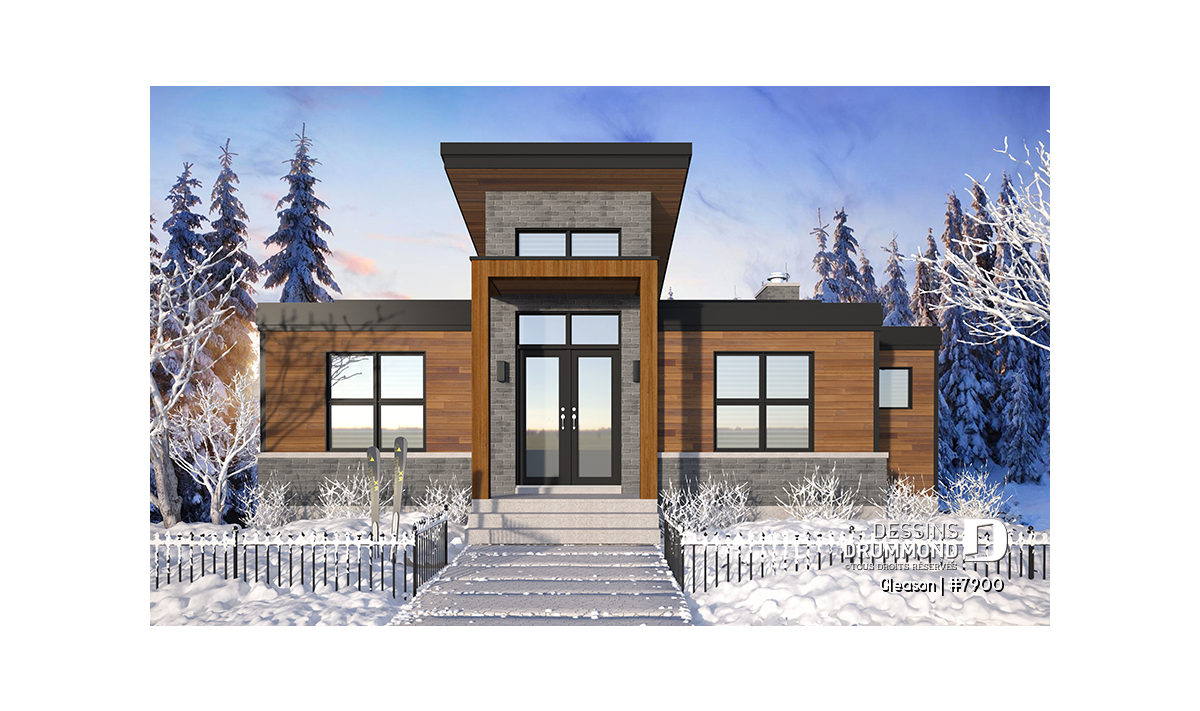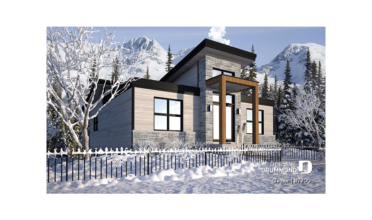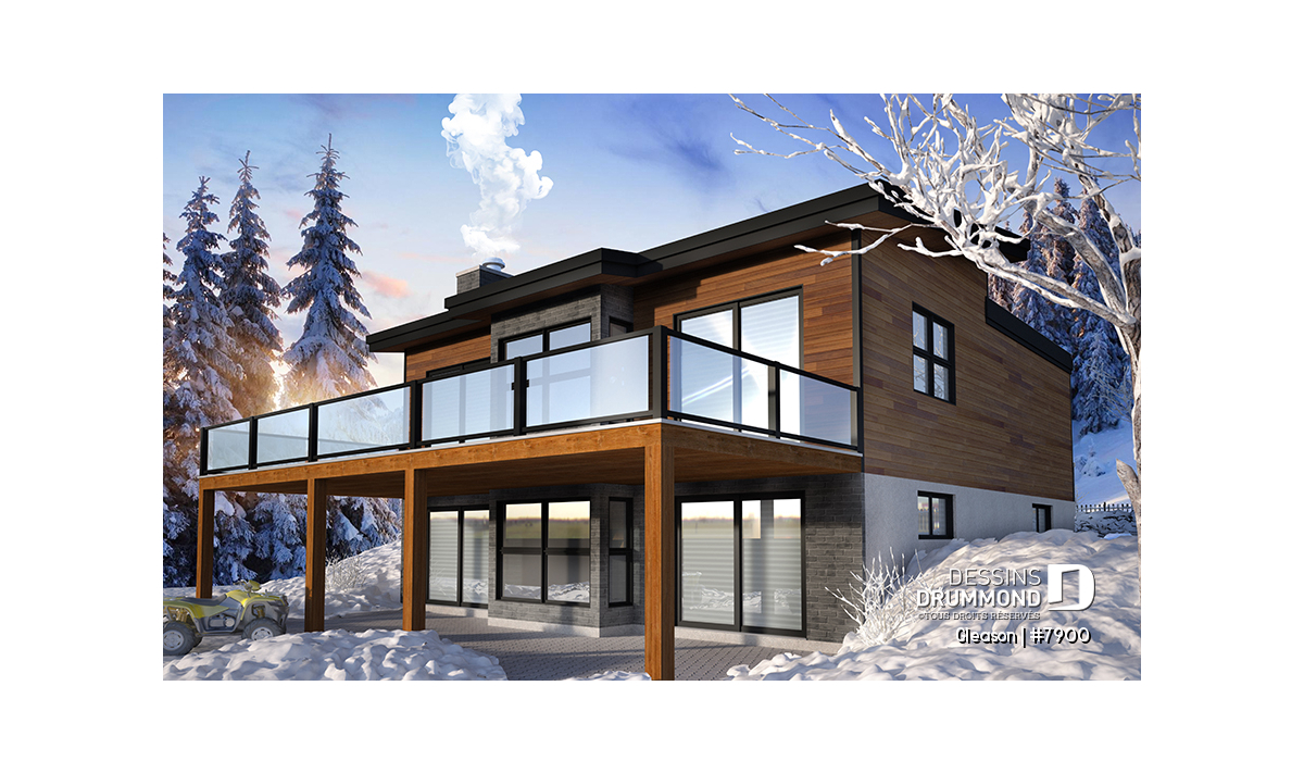 Plan de chalet 4-saisons de style contemporain avec sous-sol en rez-de-jardin.