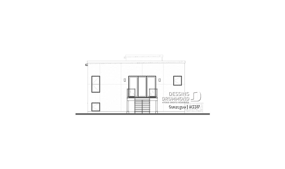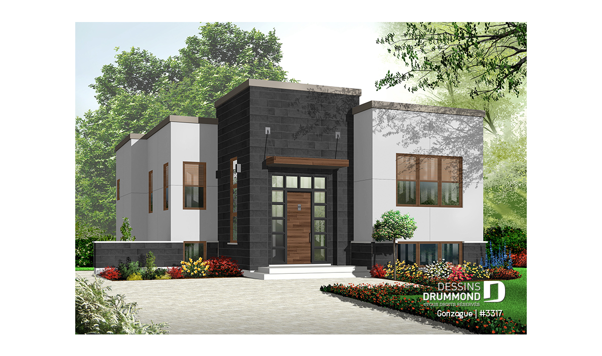 Ce magnifique plan de bungalow moderne suggère un extérieur plutôt épuré avec un heureux mariage de brique-pierre, d’enduit acrylique et de métal ainsi qu’un volume accentué à l’avant pour l’obtention d’une entrée principale remarquable avec ses 12 pieds de hauteur et tout en lumière grâce à une longue fenêtre latérale, toujours dans ce volume en brique-pierre, et par le biais de celles enveloppant la porte principale. Ici, les fenêtres en coin sont fréquentes et permettent un excellent apport en éclairage naturel.