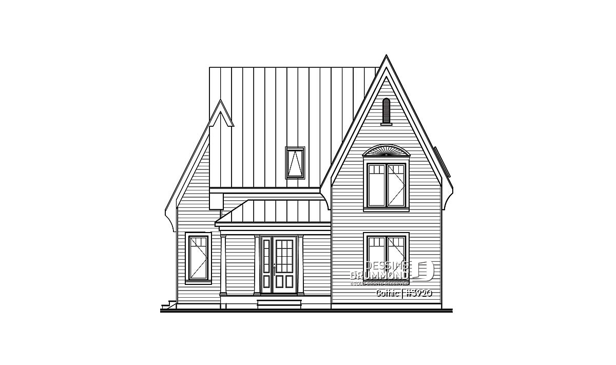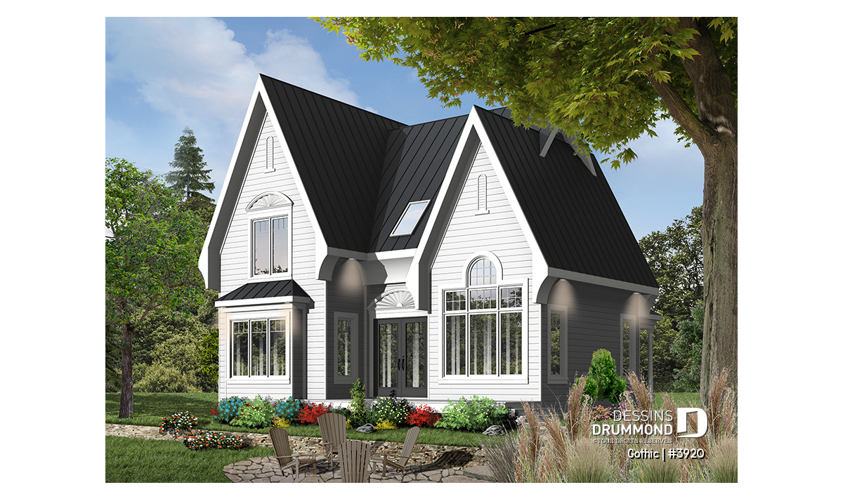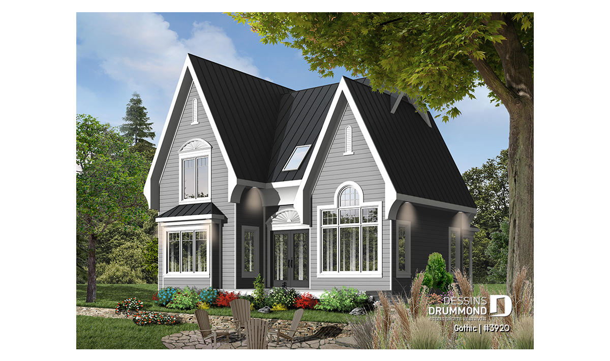 Plan de maison style Tudor, 3 chambres, plafond cathédral, mezzanine, superbe luminosité