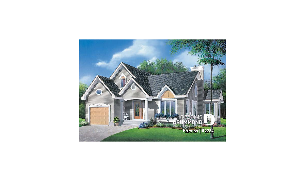 Vue avant - MODÈLE DE BASE - Plain-pied champêtre lumineux avec espace boni, garage, plafond cathédrale et sous-sol évolutif - Halarion