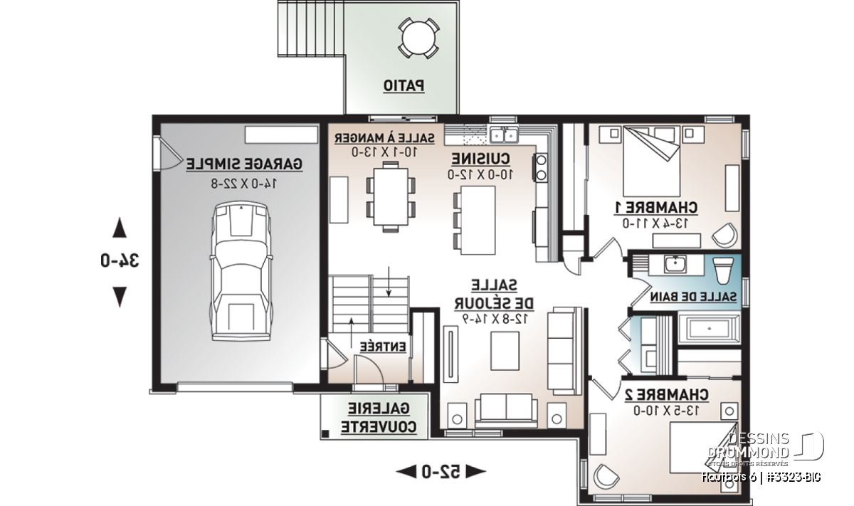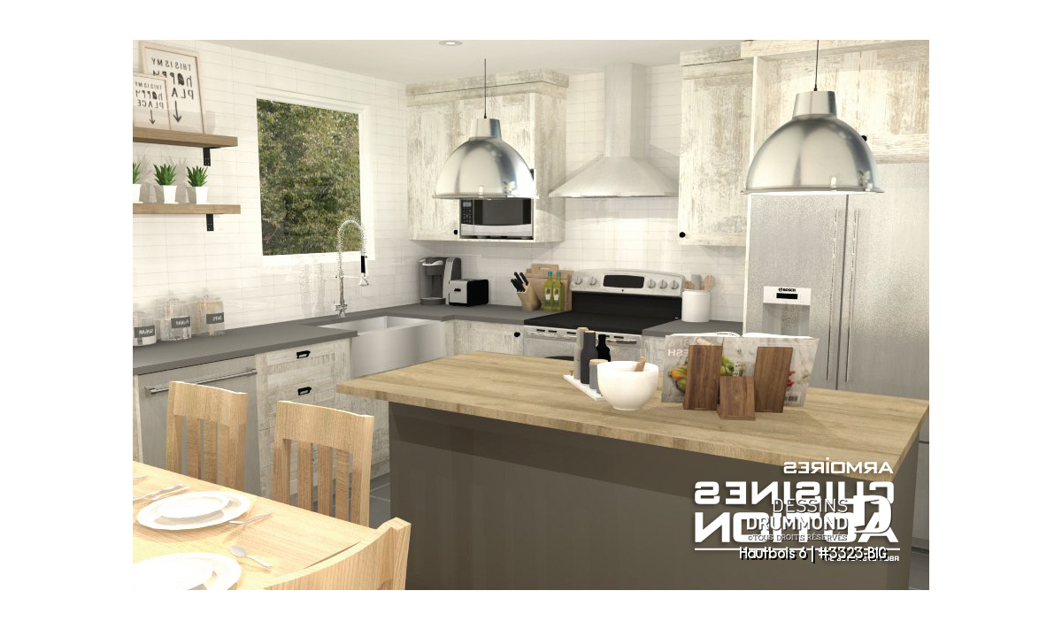 Le populaire plan 3323-V2 sert donc de base à ce modèle version afin d’obtenir un plan dont le budget de construction saura répondre aux attentes des premiers acheteurs tout en ayant une parfaite cohérence entre l’intérieur et l’extérieur de la maison. Un garage de bon format et connecté à la maison a été ajouté pour plus de commodités aux occupants.