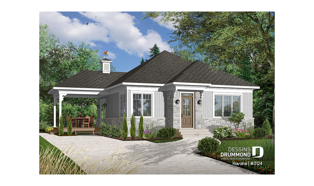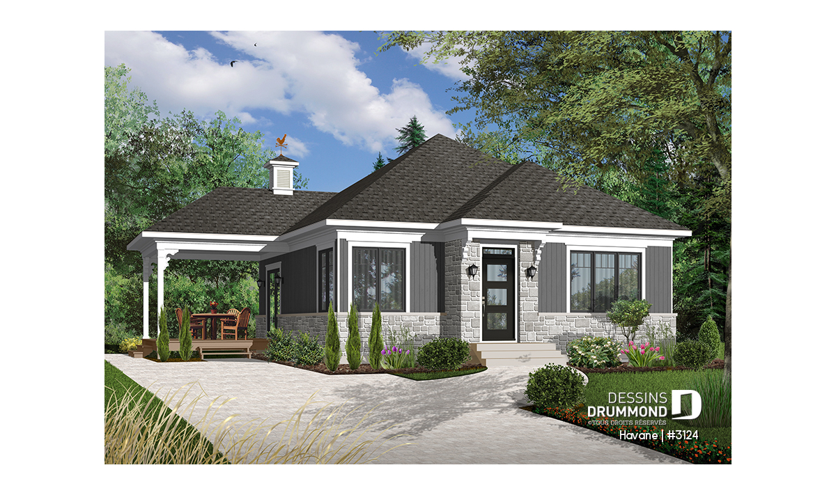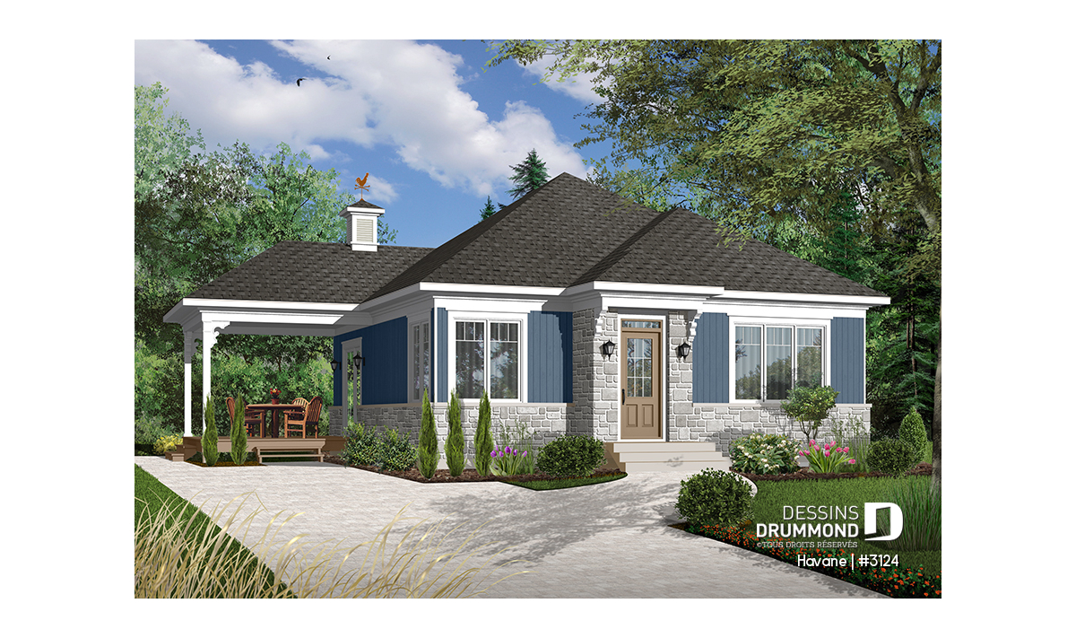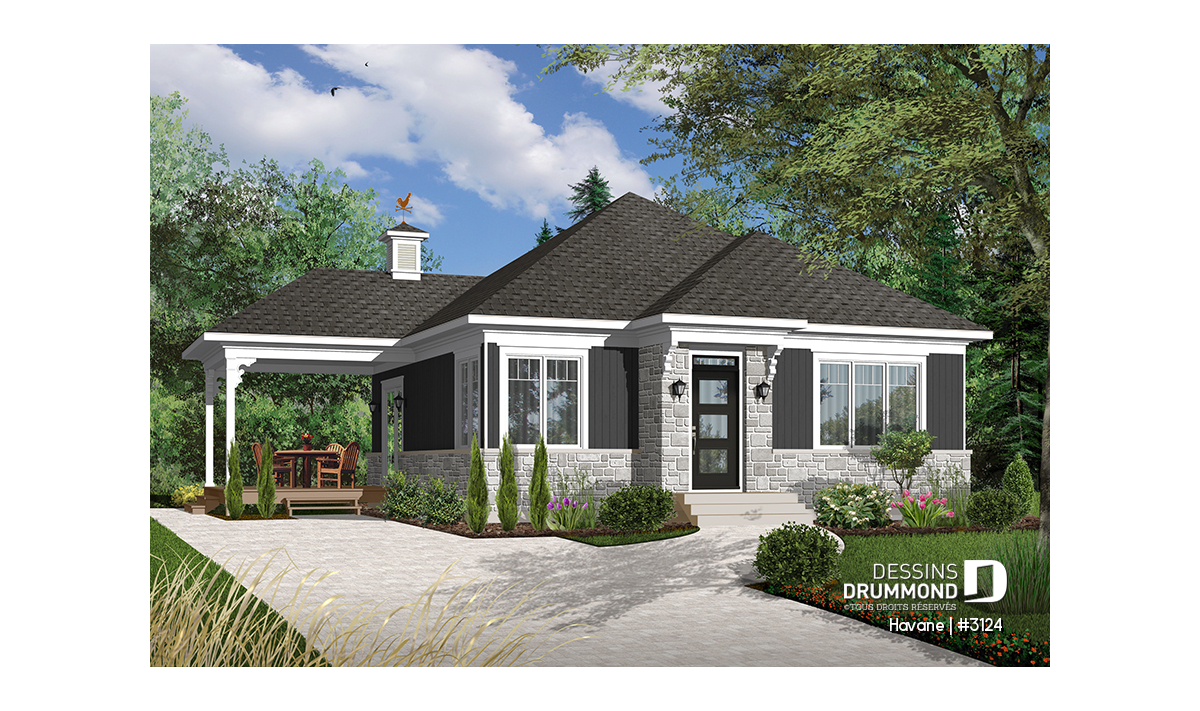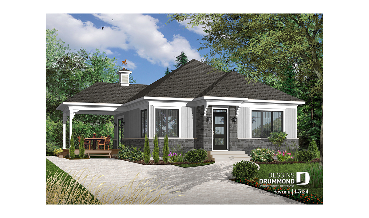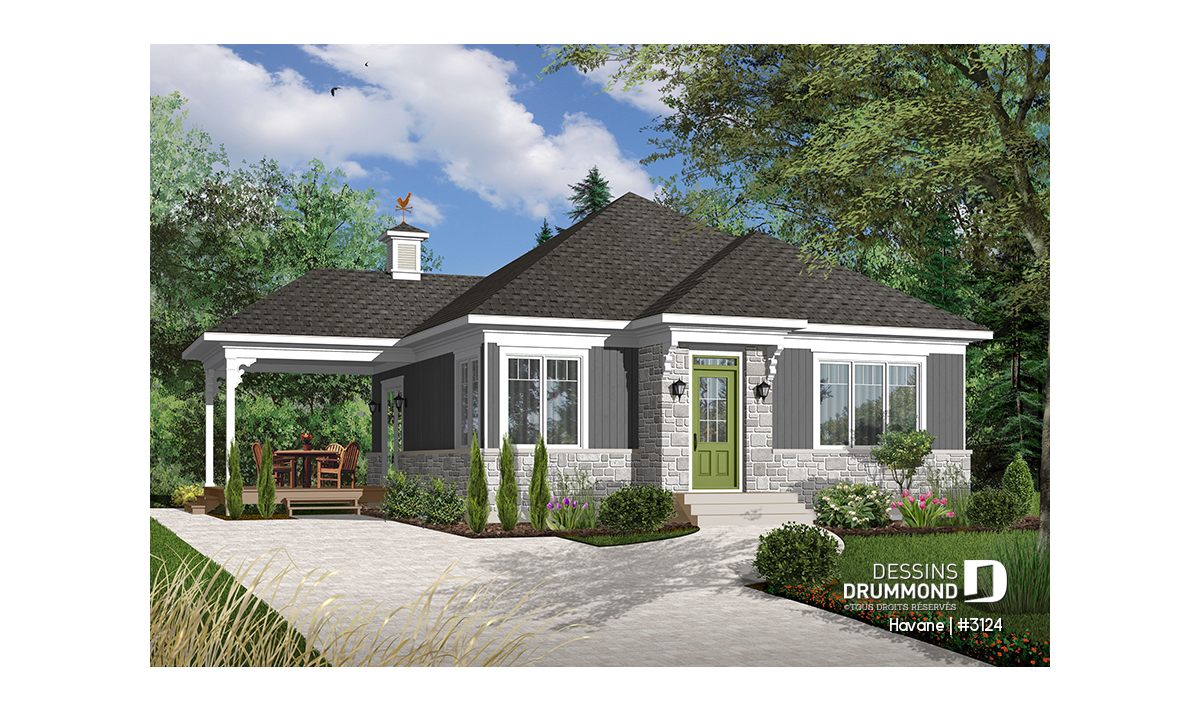 Rez-de-chaussée - Plan de bungalow économique, 2 chambres, terrasse couverte, plafond 9', salle de lavage au premier - Havane