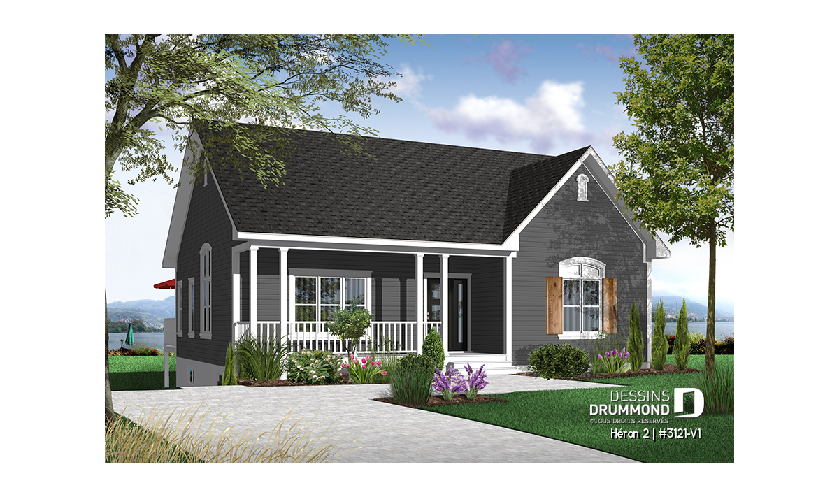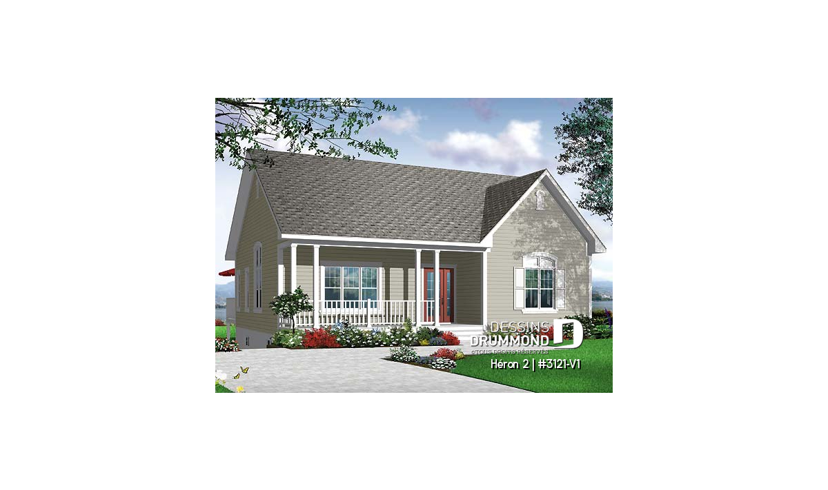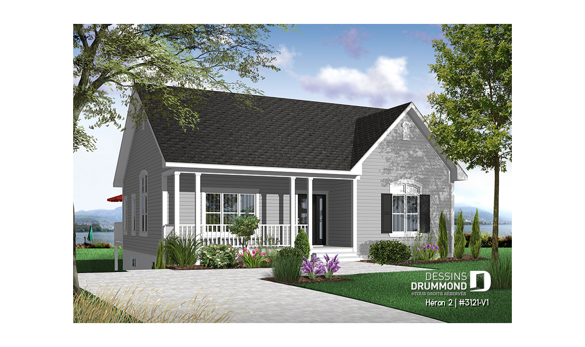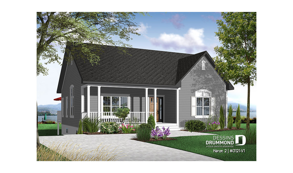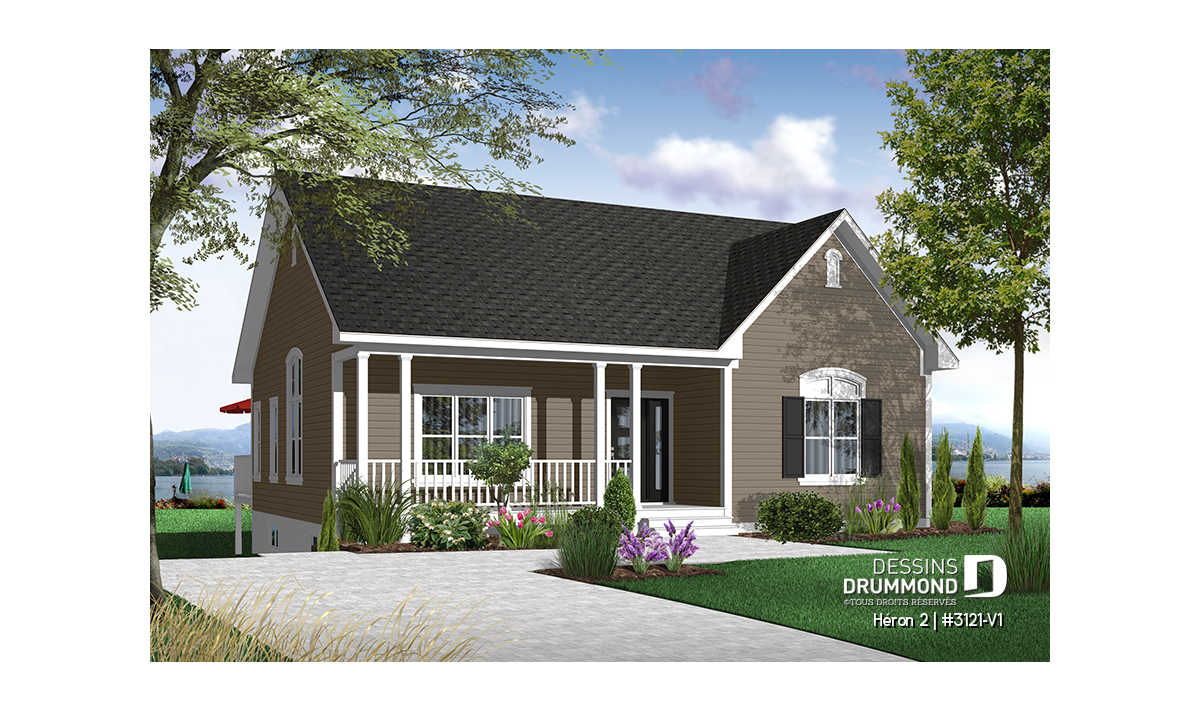 Version couleur no. 1 - Vue avant - Plan de bungalow champêtre, 2 à 4 chambres, plafond 9', vestibule fermé, garde-manger, buanderie au r-d-c - Héron 2