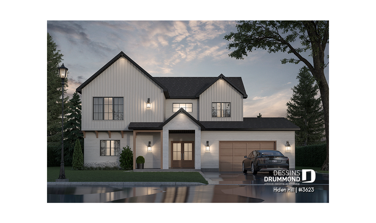 Maison Farmhouse d'inspiration Scandinave proposant quelques éléments architecturaux modernes comme ses fenêtres foncées et la forme de son perron avant abrité.