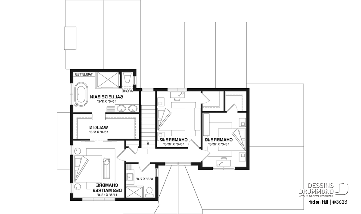 Le deuxième étage, celui des chambres, fut très bien conçu pour offrir un accès direct à la salle de bain à partir de la chambre des maîtres mais aussi une belle intimité entre cette dernière et les chambres secondaires. Chaque chambre bénéficie d’une belle espace de garde-robe, notamment celle de la chambre des maîtres qui donne accès directement à la salle de bain de cette dernière.