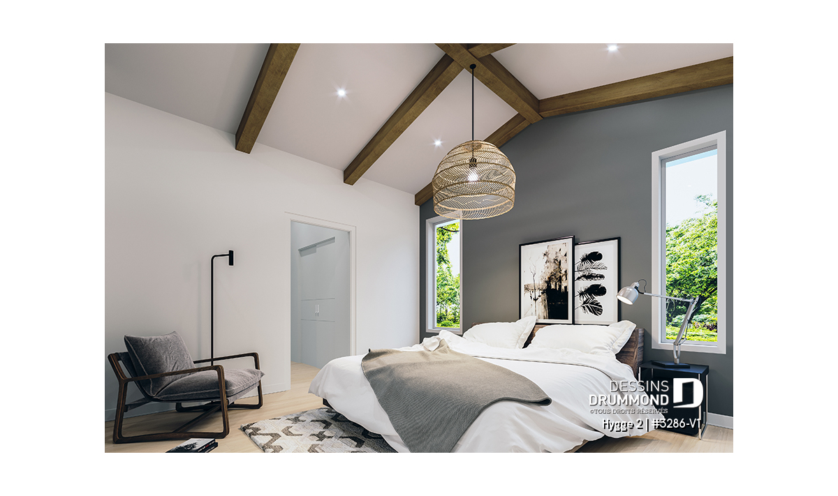 Grande chambre des parents avec plafond cathédrale, salle de bain privée et ambiance raffinée.