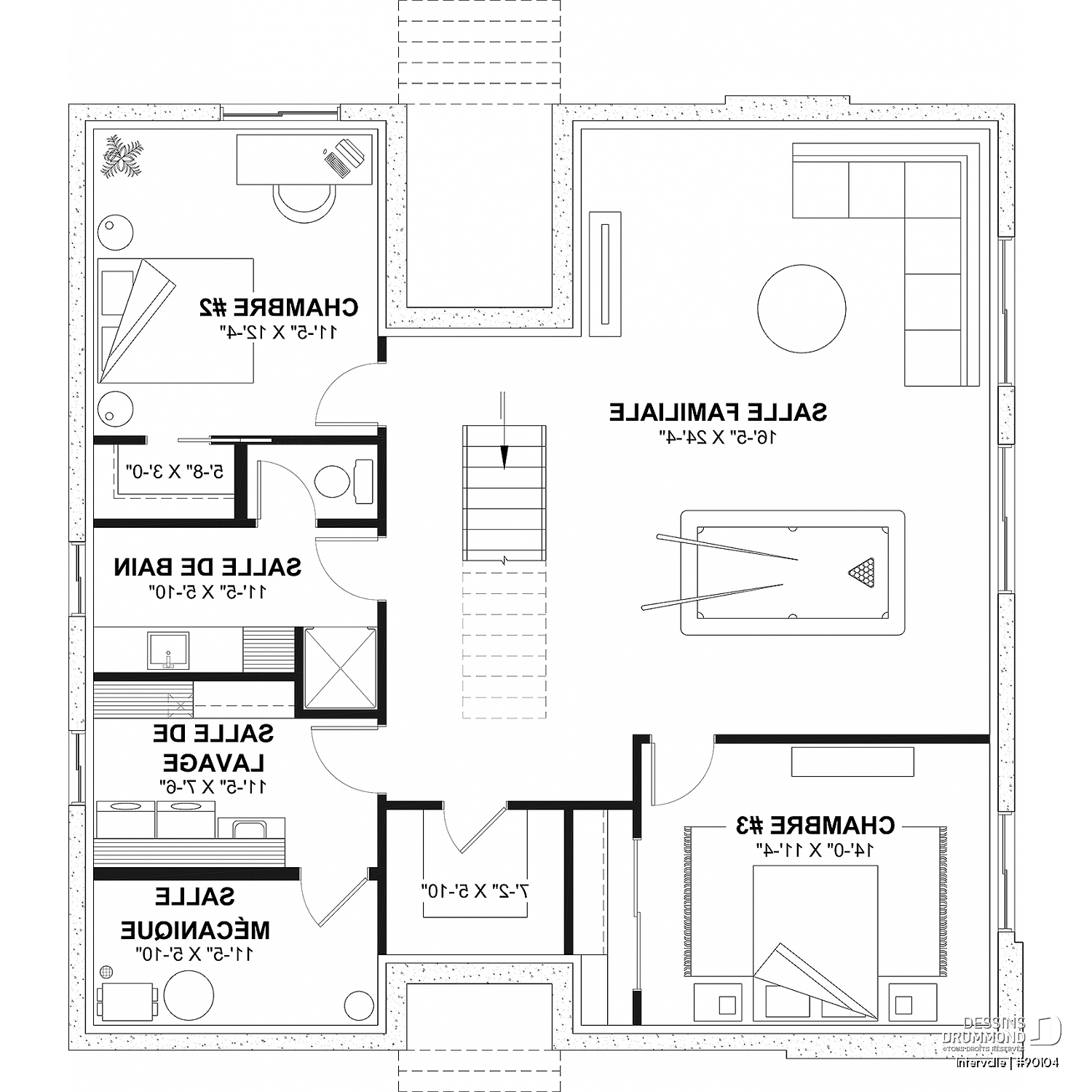 2 chambres, salle mécanique, rangement, salle de bain, salle de lavage, salle familiale (ou chambre #4) et salle de jeux.
