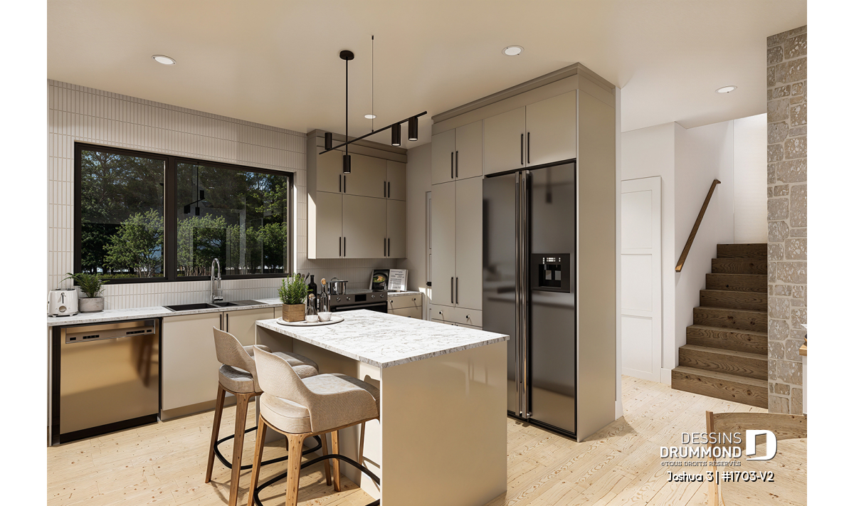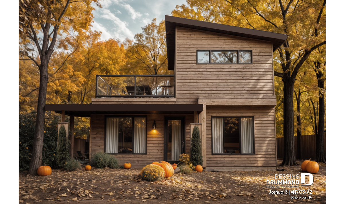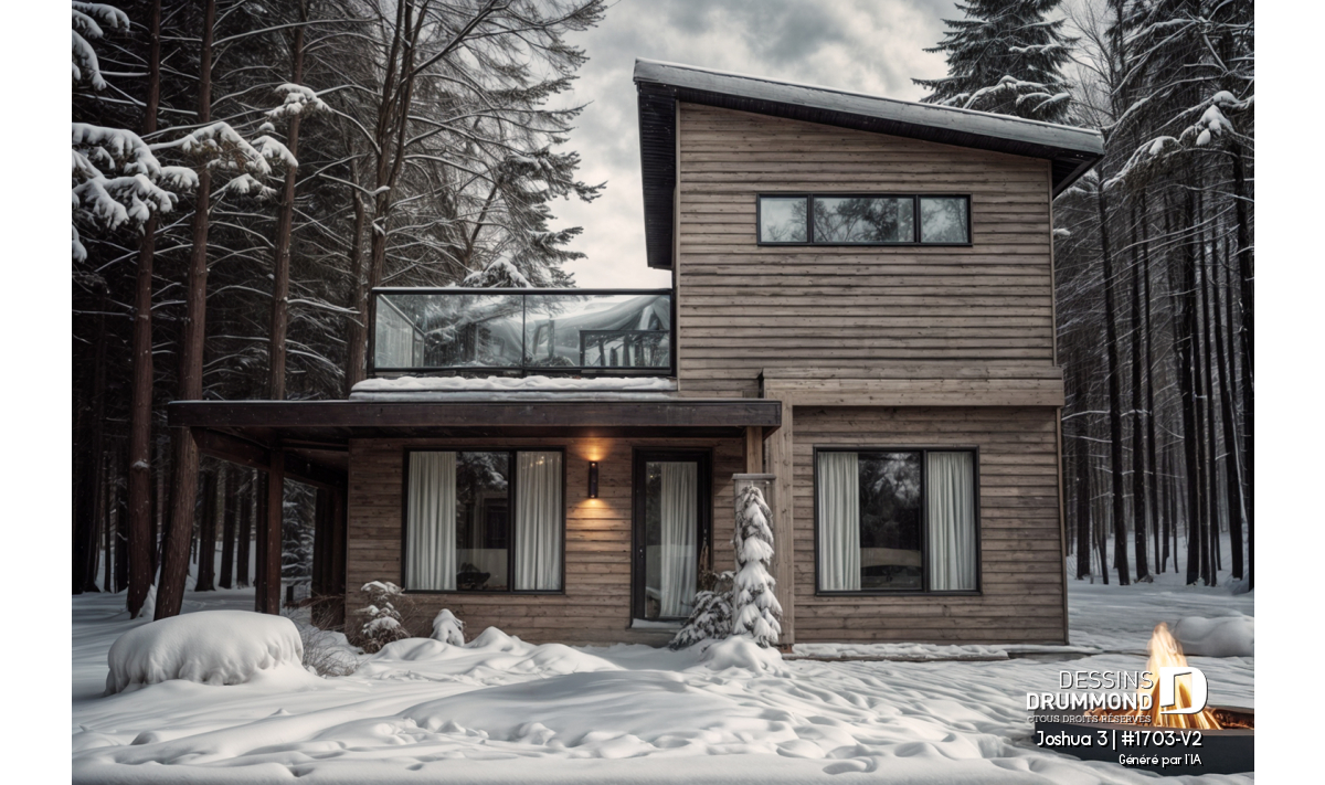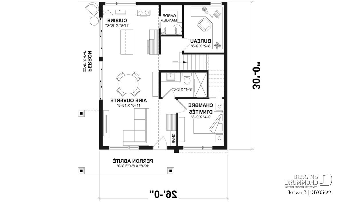 Le plan de maison Joshua 3 (1703-V2) propose une surface habitable de 1200pi2. La hauteur de tous les plafonds est de 8pi. La fondation prévue est une dalle flottante, bien que d'autres options de fondation sont disponibles.