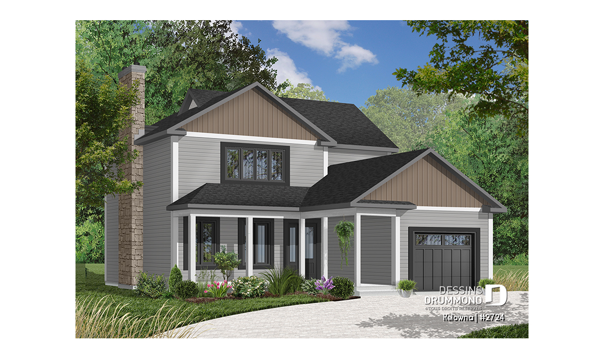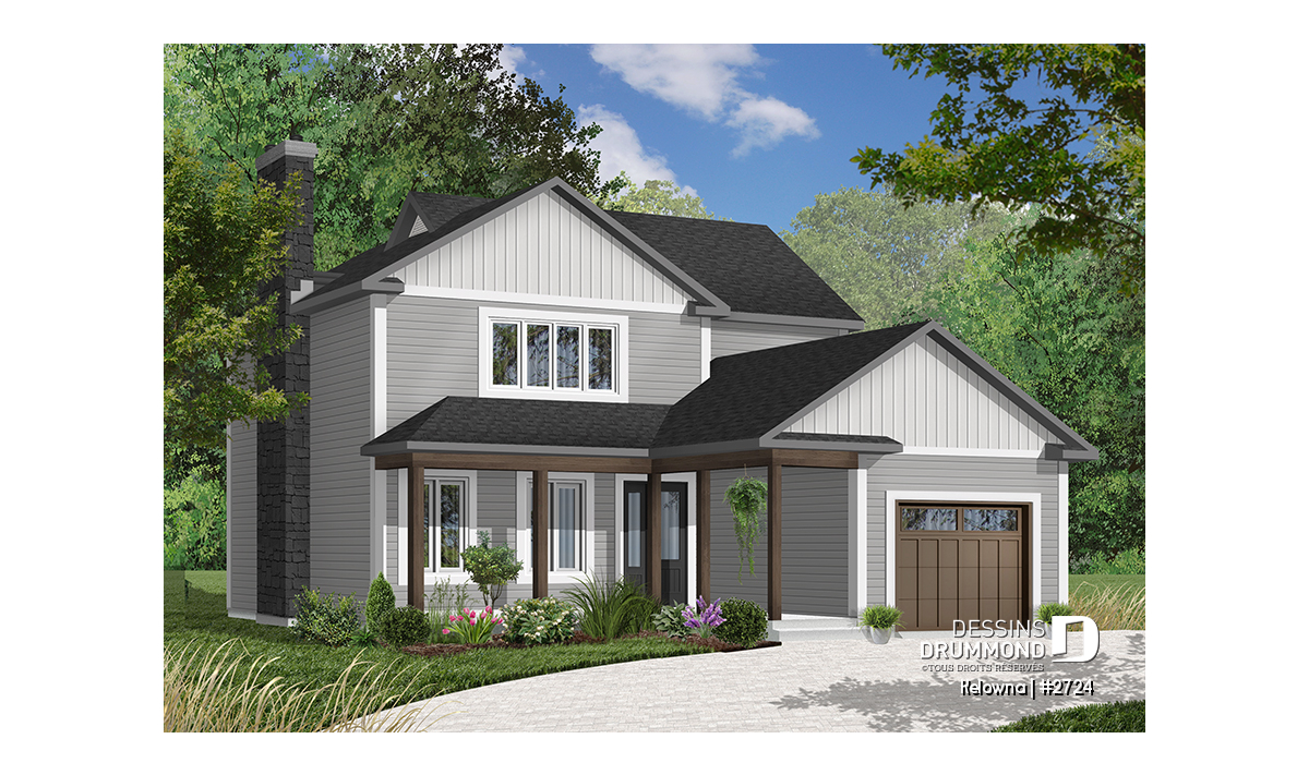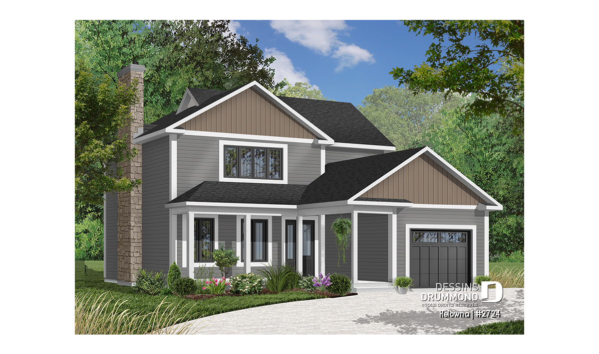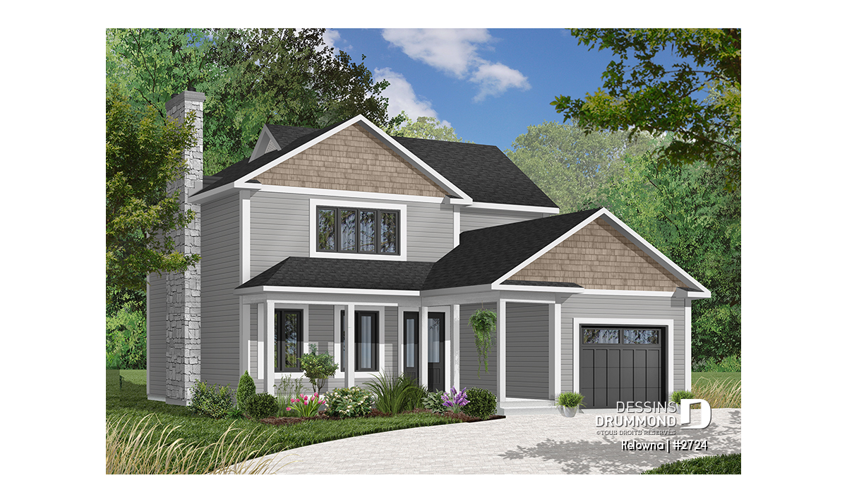 Foyer avec sortie possible au sous-sol, plafond en pente dans la chambre des maîtres, galerie abritée à l'avant, garage avec porte de service sur le côté et accès à la maison, fenestration généreuse au puits d'escalier, coin buanderie près de la cuisine, porte de service et porte-fenête près de la cuisine.