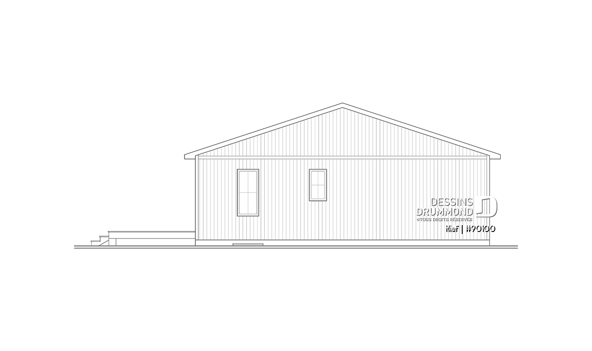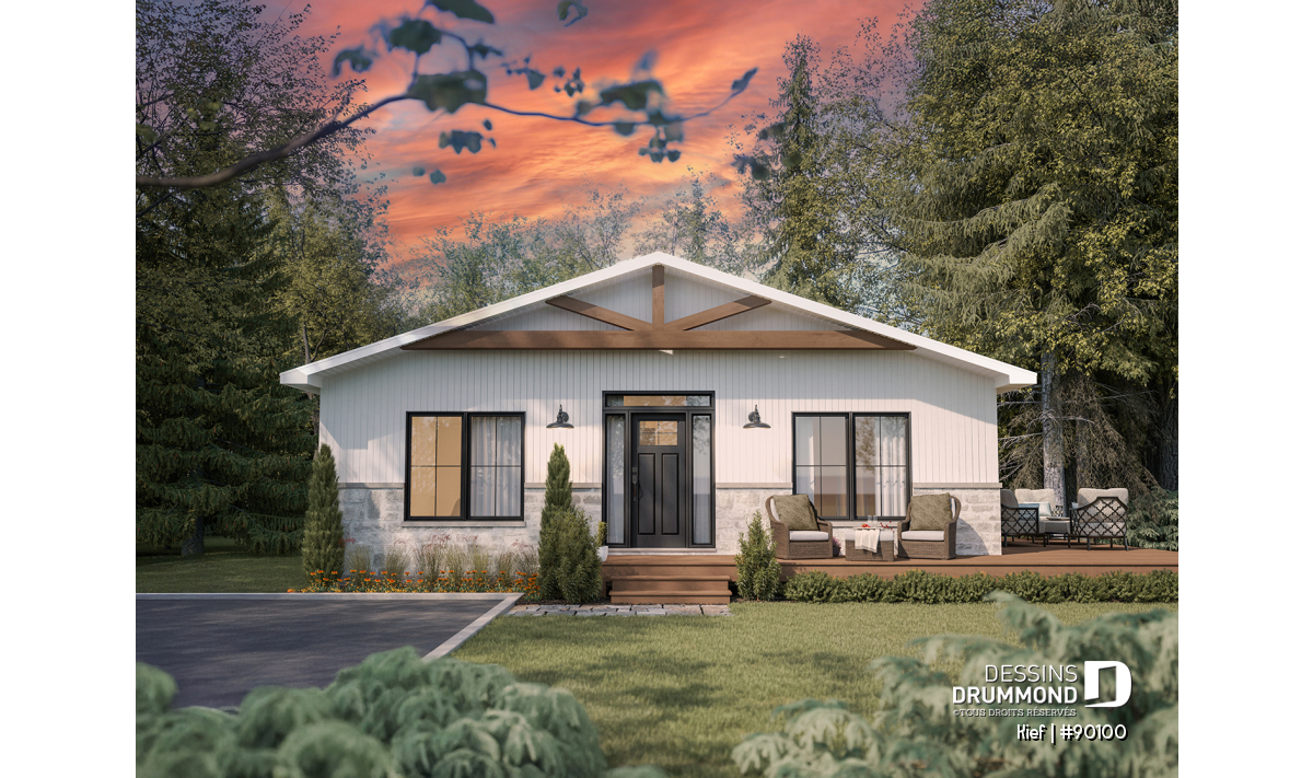 Vue avant - MODÈLE DE BASE - Plan éco-responsable petit chalet ou maison compacte, 2 à 4 chambres, cathédral, s-sol aménagé optionnel ($) - Kief