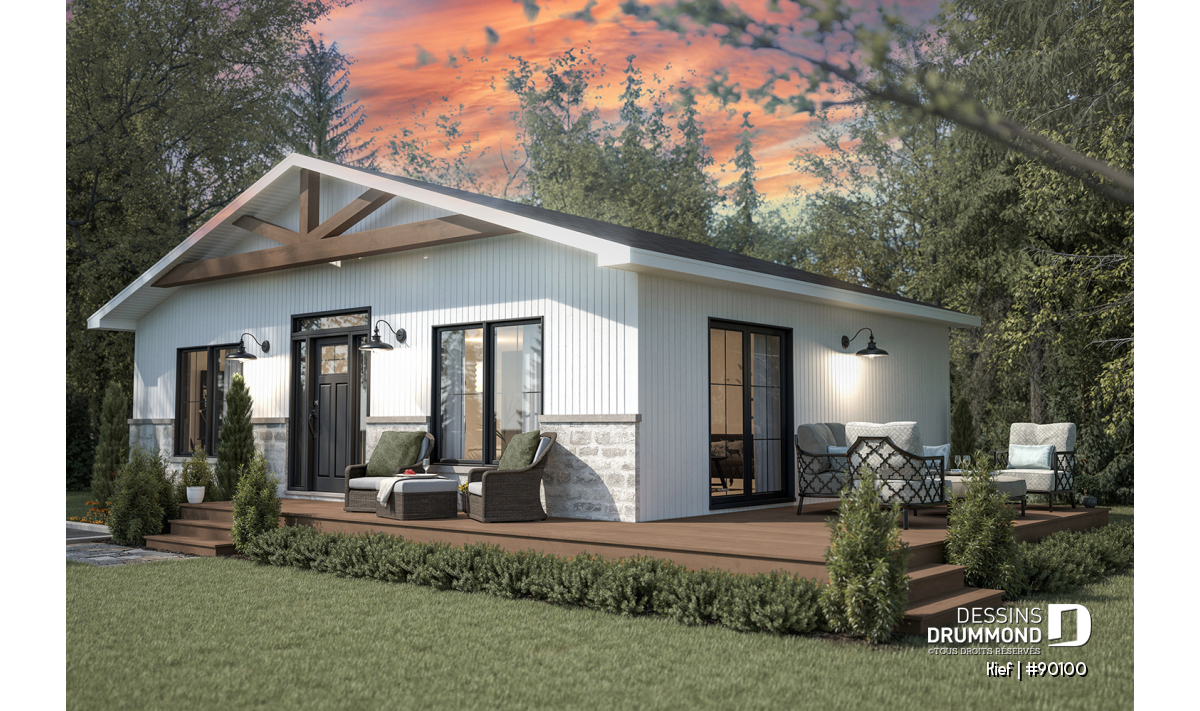 Sous-sol aménageable - Plan éco-responsable petit chalet ou maison compacte, 2 à 4 chambres, cathédral, s-sol aménagé optionnel ($) - Kief