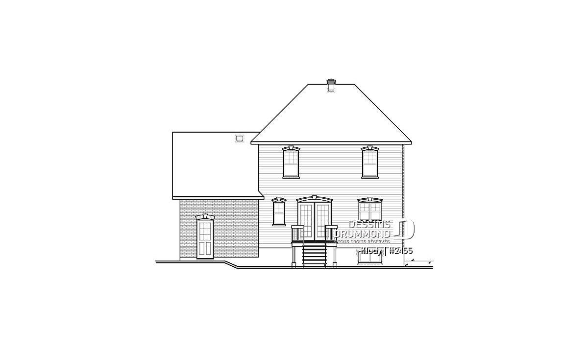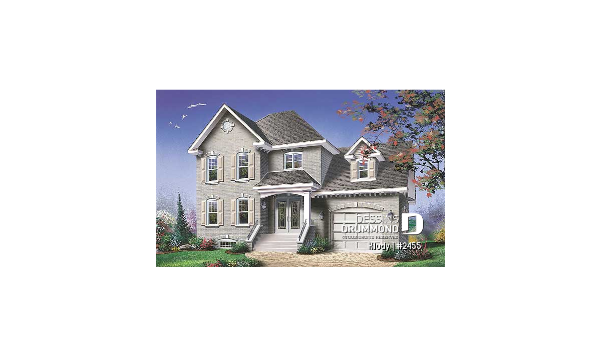Vue avant - MODÈLE DE BASE - Maison style européenne, espace boni au-dessus du garage, 3 chambres, vestibule, grande salle bain - Kiludy