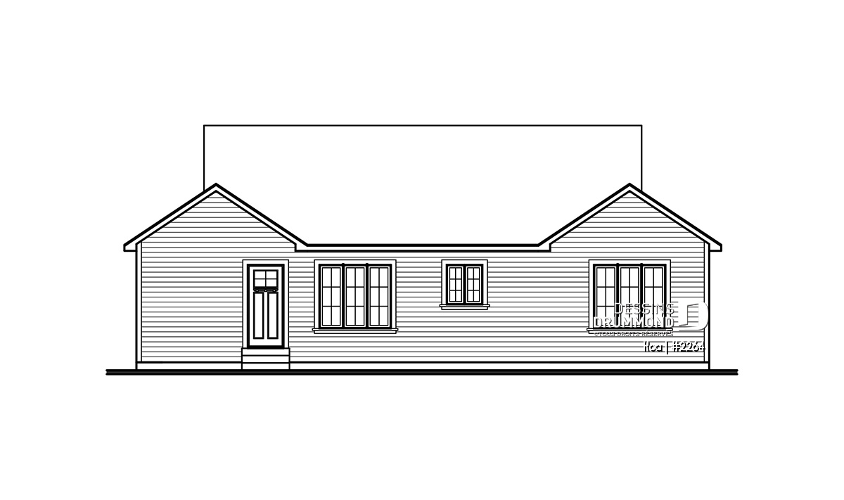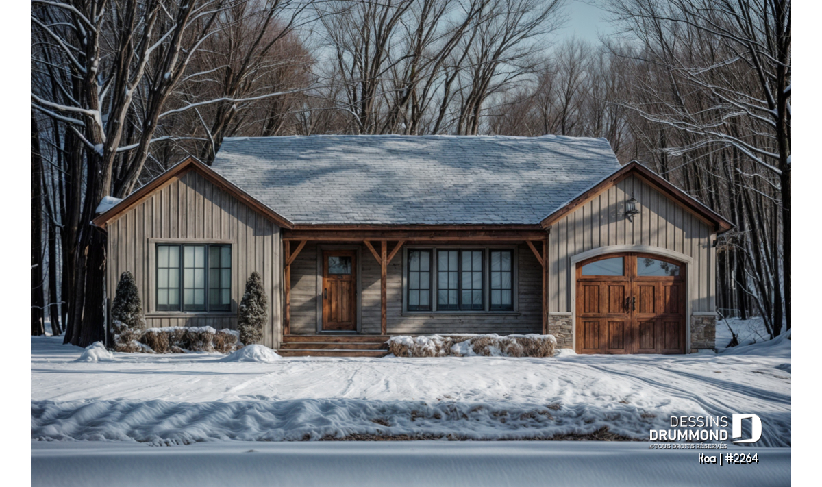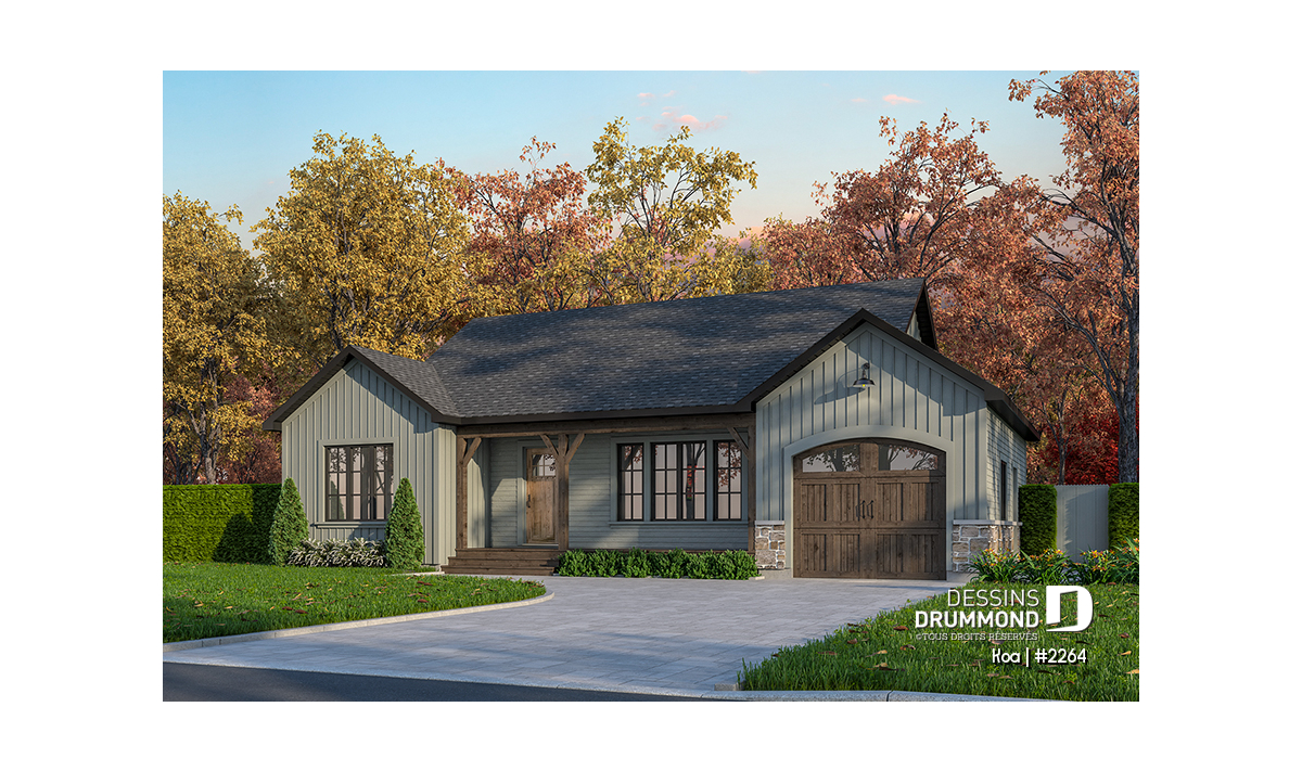 Ce plan propose deux chambres confortables au rez-de-chaussée, idéales pour un couple, une jeune famille ou encore comme résidence secondaire. Pour ceux qui désirent plus d’espace, le sous-sol peut être aménagé selon vos besoins : chambres additionnelles, salle familiale, salle de jeux ou coin bureau, les possibilités sont nombreuses.