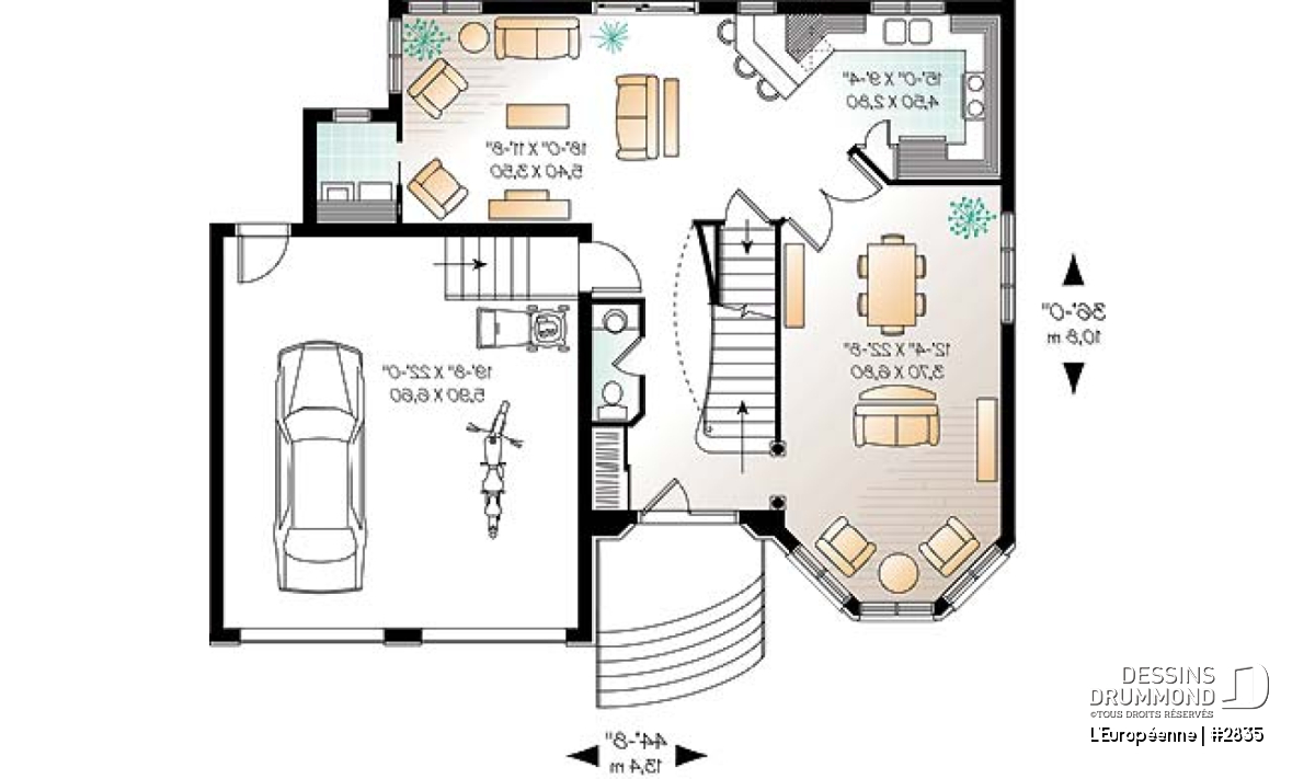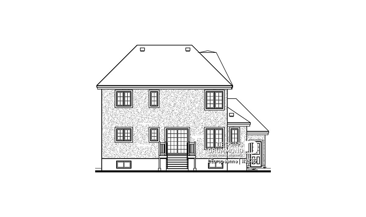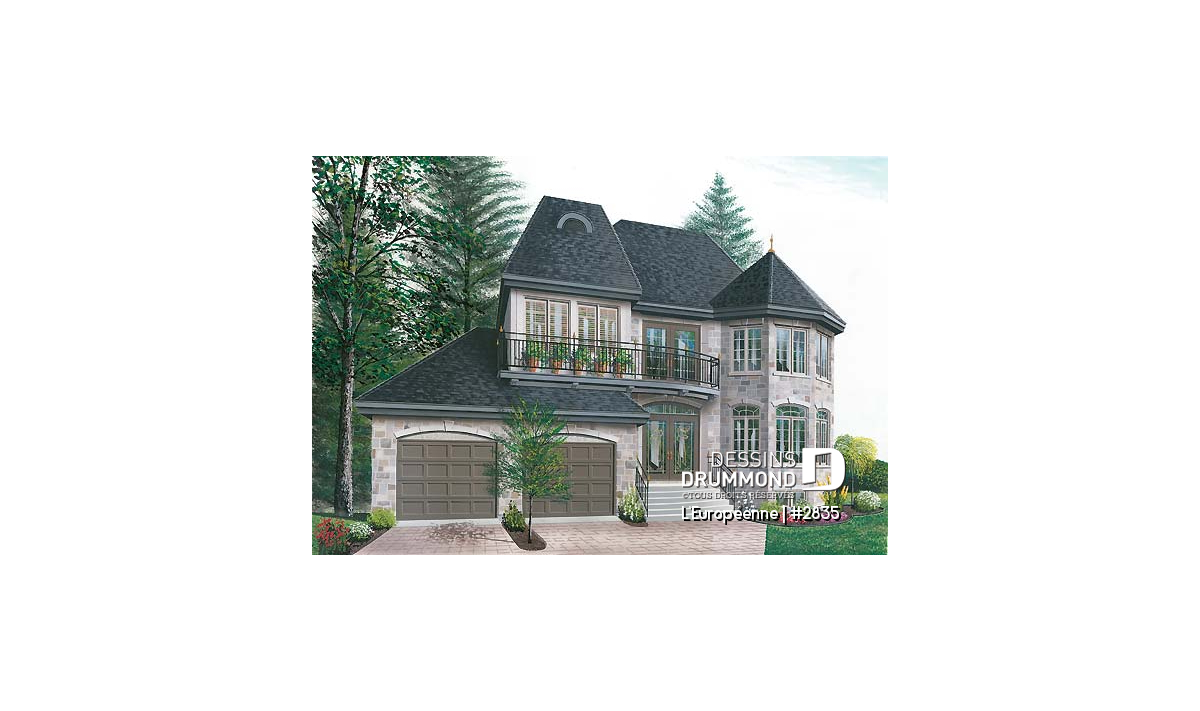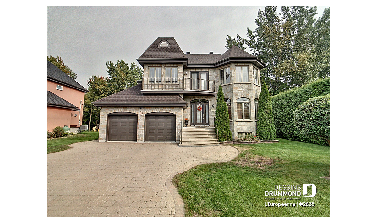 D’une largeur de moins de 45 pi. de façade, ce cottage surprend par son « look » imposant et le garage double qu’il suggère. Deux tourelles aux volumes nuancés assurent noblesse et distinction avec l’usage de matériaux de qualité comme la pierre, l’enduit acrylique et le fer forgé.