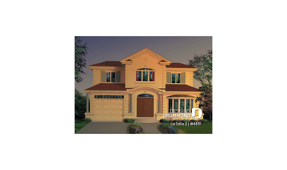 Plan de maison style Floride, 4 grandes chambres, solarium, plafond 9', 2 balcons, garage