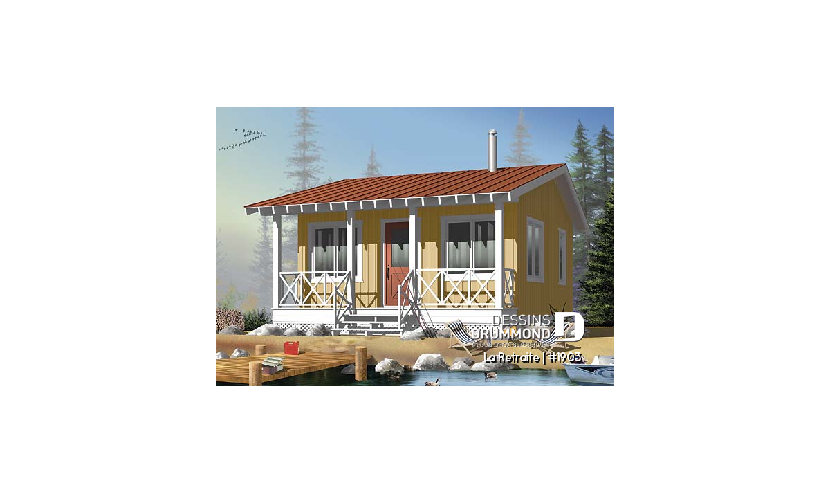 Qui a dit qu'un petit chalet doit être rudimentaire? Ce charmant plan de chalet économique de 400 pieds carrés offre tout le confort nécessaire, y compris une chambre, une salle de douche (optionnel sur la version 3-saisons), une cuisine avec coin repas, un salon et même un espace pour se réchauffer à côté d'un poêle à bois.