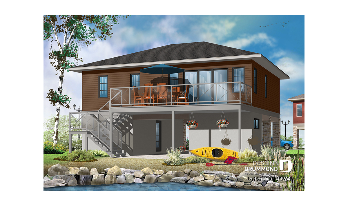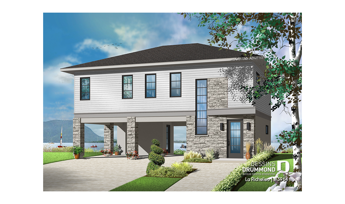 Afin d’offrir une solution d’espoir aux propriétaires de terrains situés en zone inondable comme ceux du Richelieu qui ont été grandement éprouvés au printemps 2011 par les inondations, Dessins Drummond propose cette maison, La Richelieu, en guise de maison à la fois sécurisante, pensée pour être inondée au rez-de-chaussée, de budget accessible (à partir de 157000$) et, bien entendu, avec vue panoramique arrière comme tant prisée par les résidants riverains.