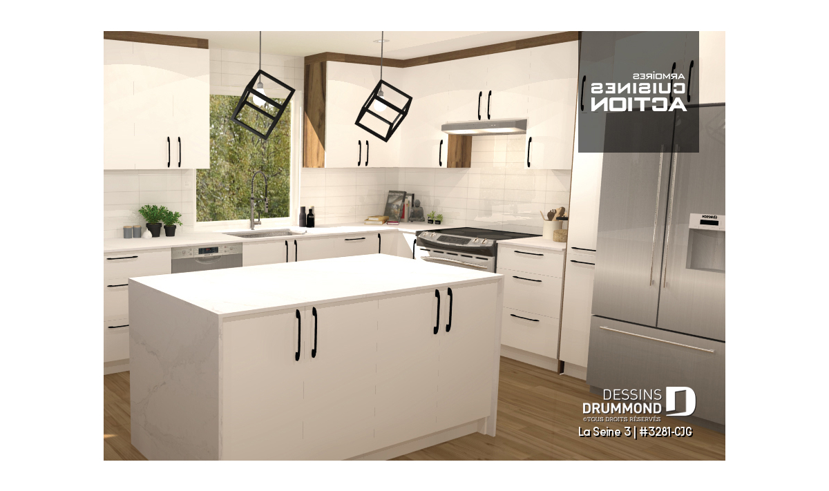 Conçu à partir du déjà très populaire plan 3281-V1, ce modèle version se veut encore plus logeable avec son plafond toujours à 9 pieds de hauteur sur tout le rez-de-chaussée et l’addition d’une chambre supplémentaire, pouvant servir autant de bureau à domicile, pour un total de 3 chambres.
