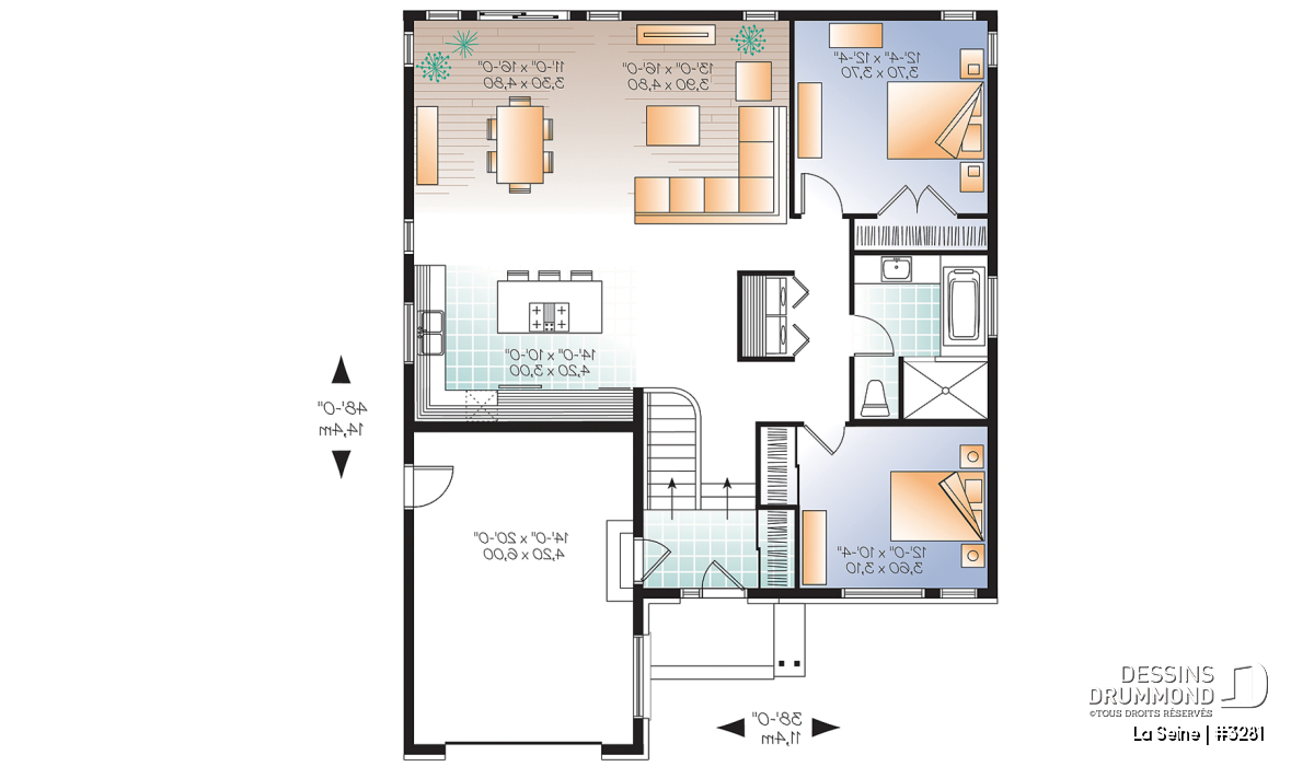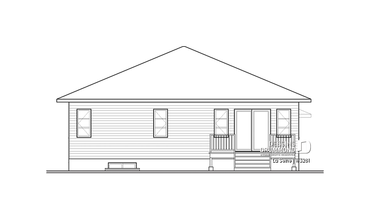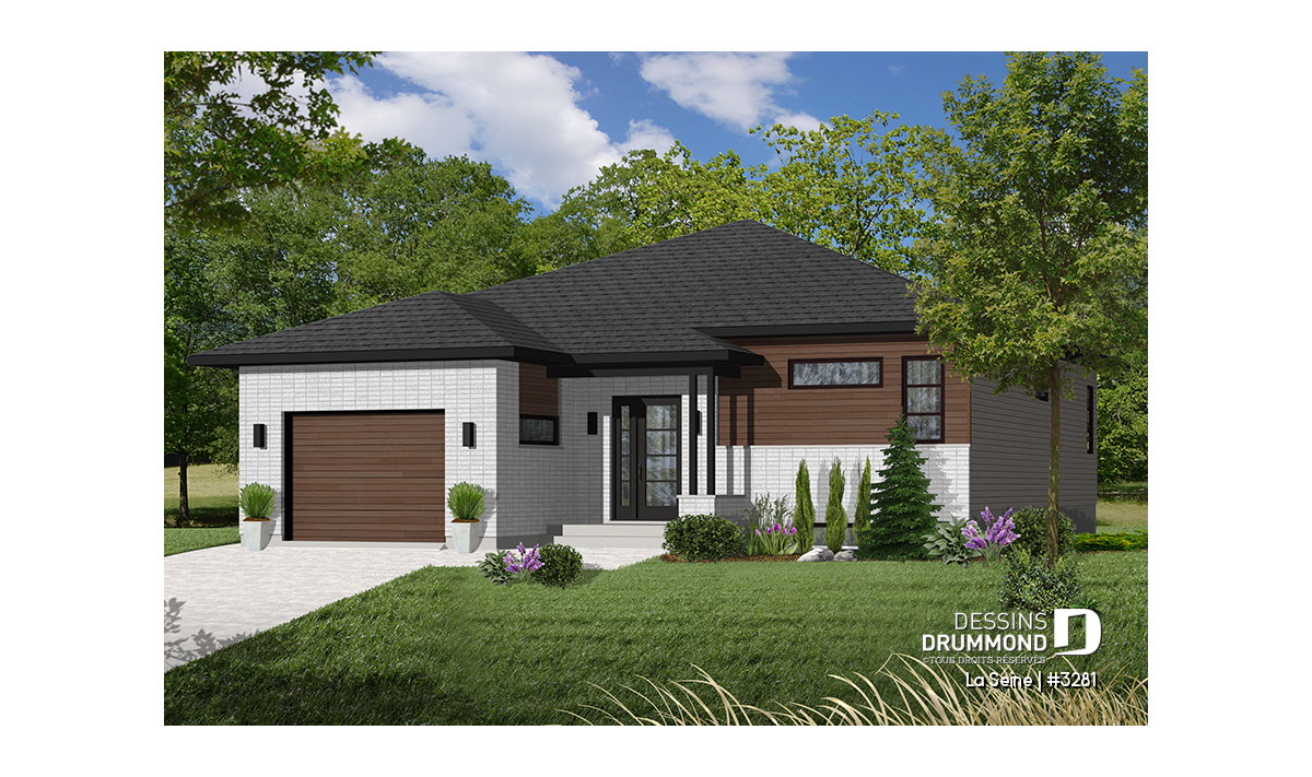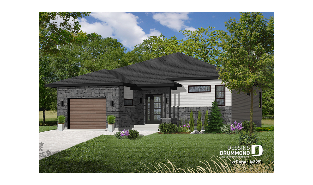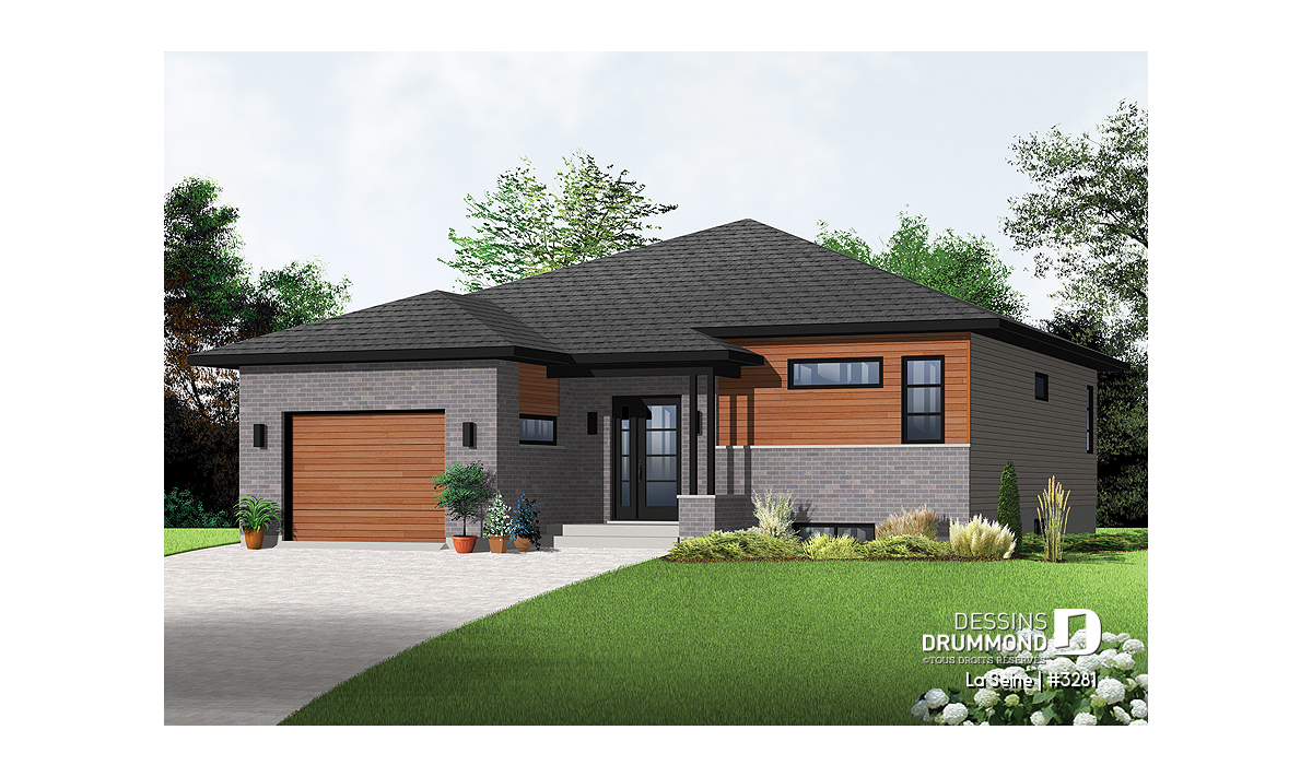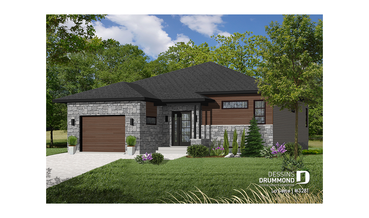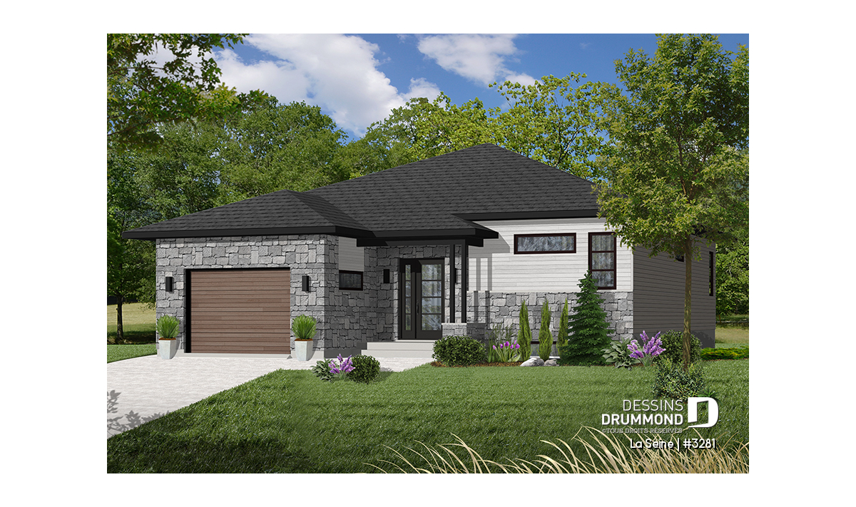 Suite à un sondage réalisé auprès de 450 répondants et proposant 3 intérieurs différents que les internautes intéressés avaient aussi le loisir de commenter, Dessins Drummond a mis de l’avant deux plans de plain-pied contemporain avec les deux intérieurs ayant suscité le plus d’intérêt ou reçu le plus de votes. Voici donc le 3281 faisant 38pi de largeur par 48pi de profondeur avec garage bien intégré de 14pi x 20pi intérieur et toiture simplifiée.