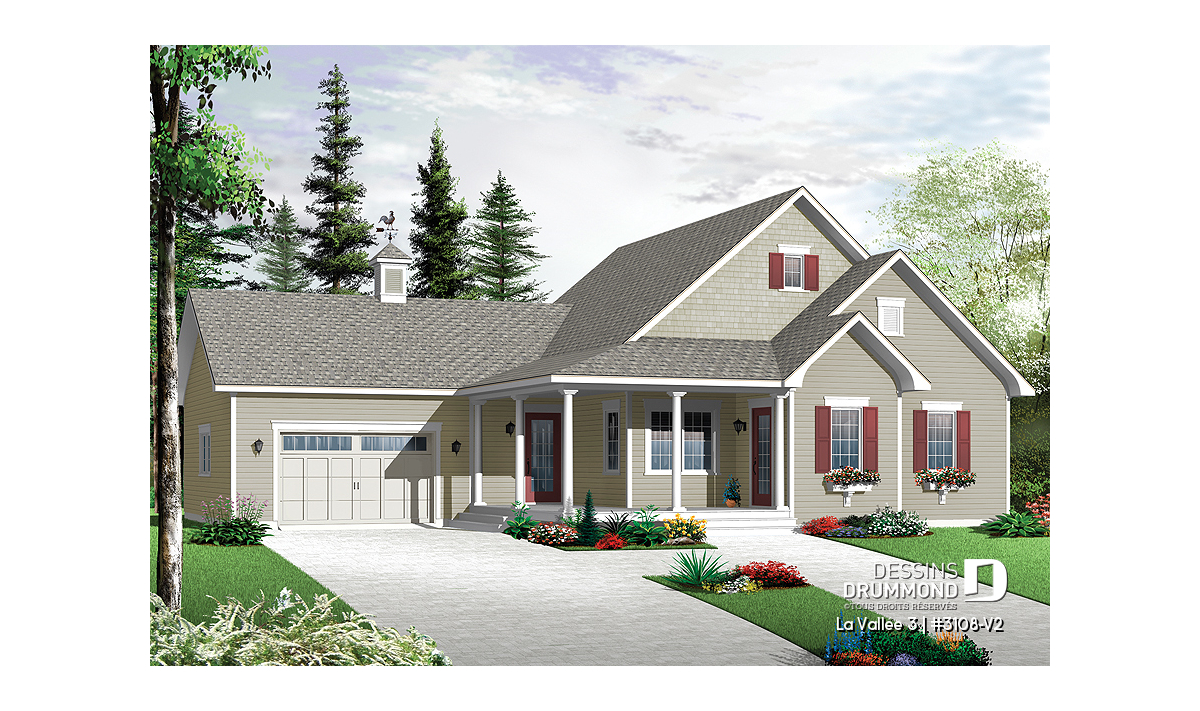 Vue avant - MODÈLE DE BASE - Plan de plain-pied 2 chambres avec garage, coin ordinateur, accès s-sol par garage, vestibule fermé - La Vallée 3