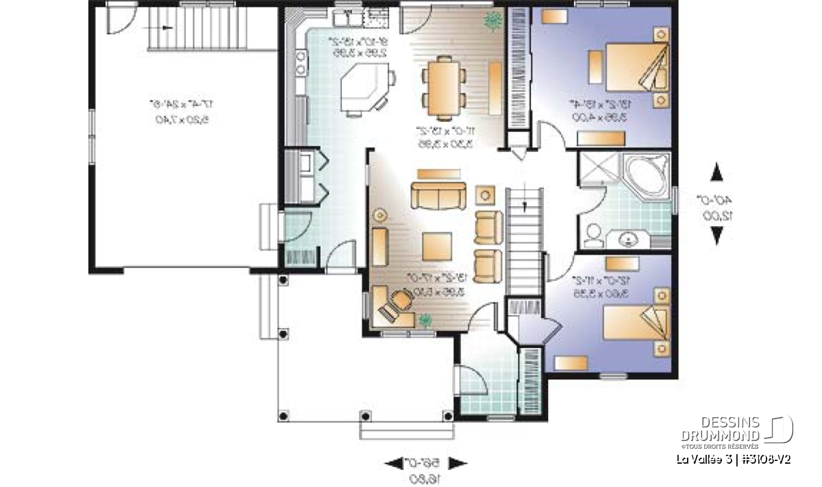 Plan de plain-pied 2 chambres avec garage, coin ordinateur, accès s-sol par garage, vestibule fermé