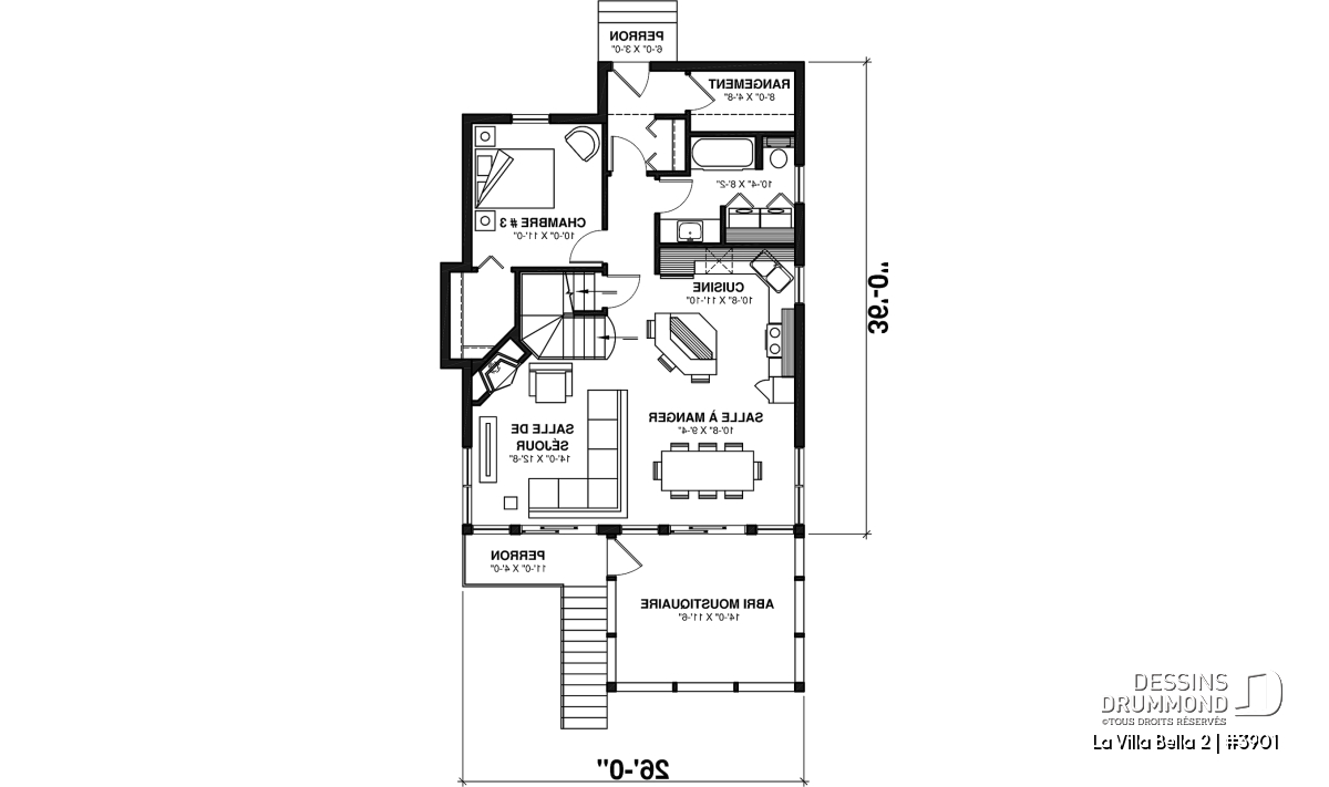 À l’intérieur, en entrant par l’avant de la maison, on est agréablement surpris par un rangement tout à fait adéquat à ce genre d’habitation et par la présence d’une chambre et d’une salle de bain complète au rez-de-chaussée. Ensuite, on constate l’aménagement d’un secteur activités entièrement ouvert et caractérisé par une cuisine en « L » avec îlot-lunch central, une salle à manger abondamment fenêtrée et donnant dans la terrasse avec moustiquaire et une salle de séjour tout autant fenêtrée et agrémentée d’un foyer en coin et d’un accès à la galerie extérieure dotée, pour sa part, d’un escalier permettant d’accéder au terrain.