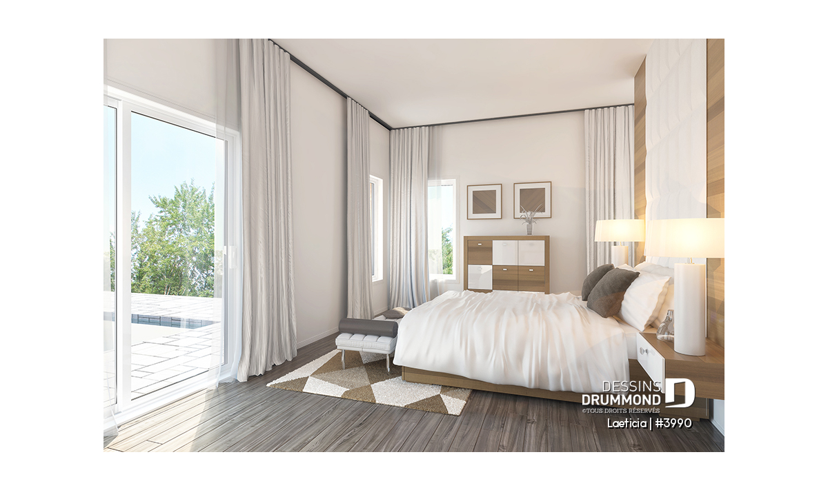 Chambre des maîtres avec porte vers la piscine, grand walk-in derrière le lit et accès direct à la salle de bain complète.