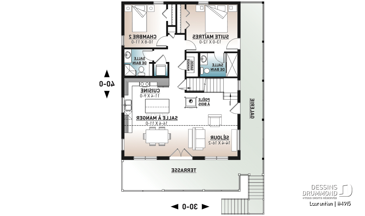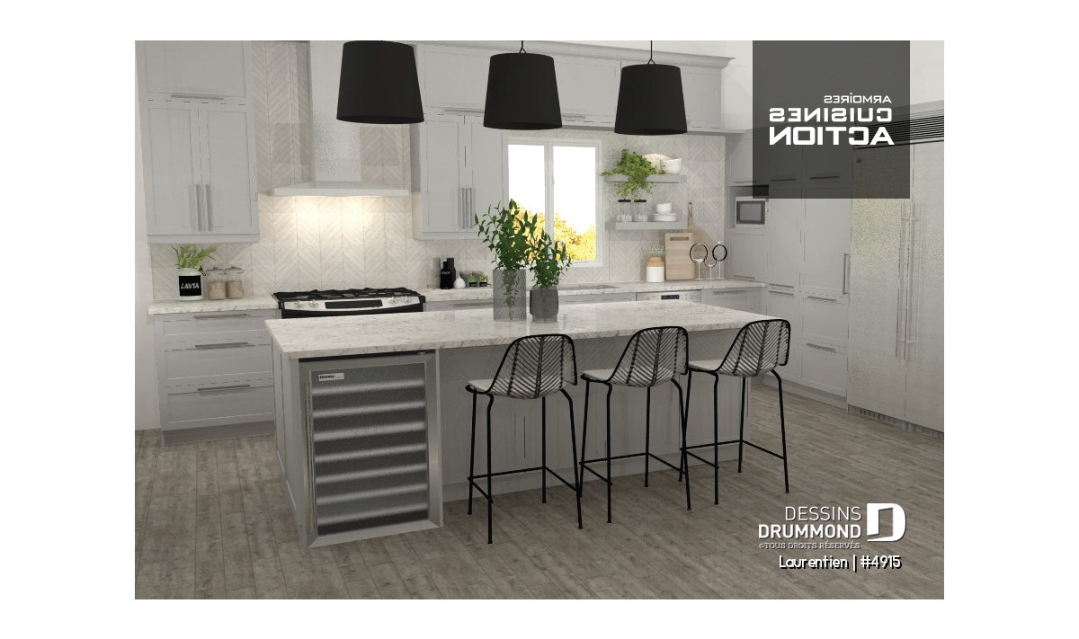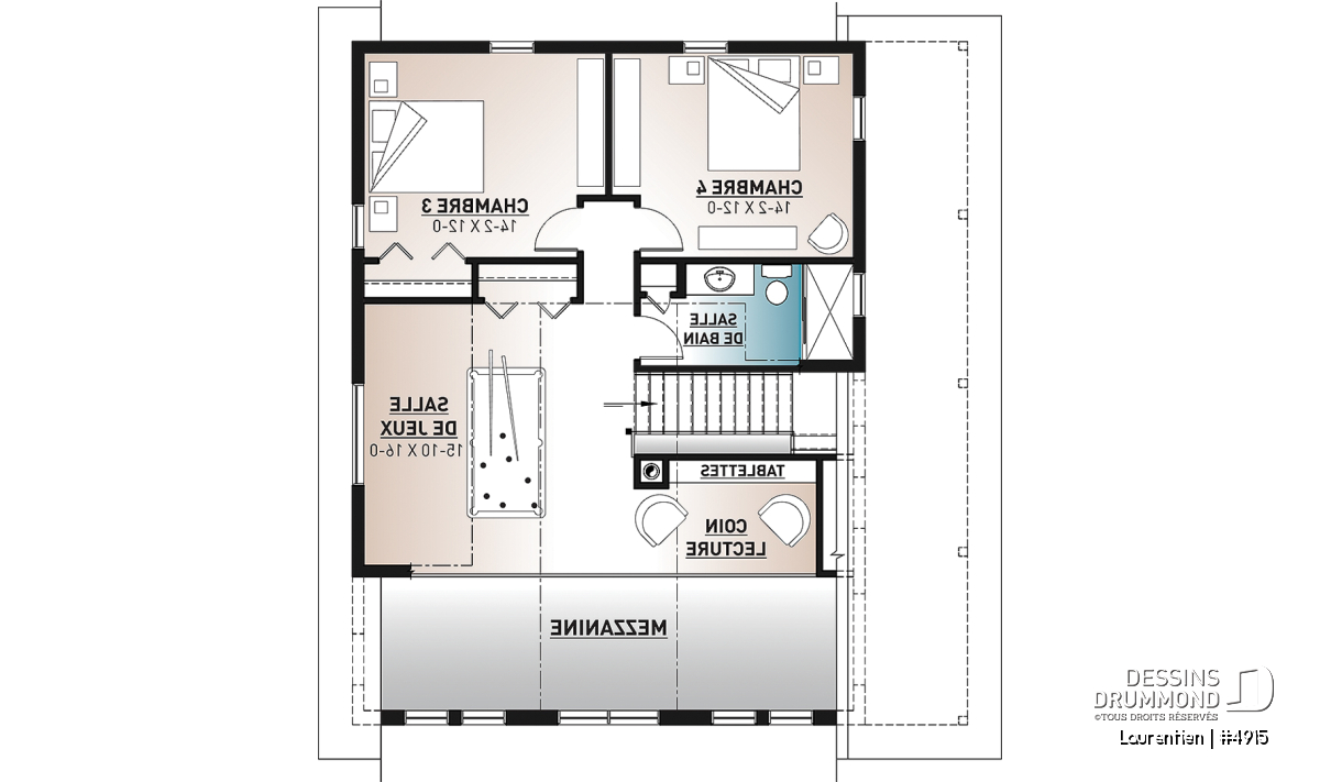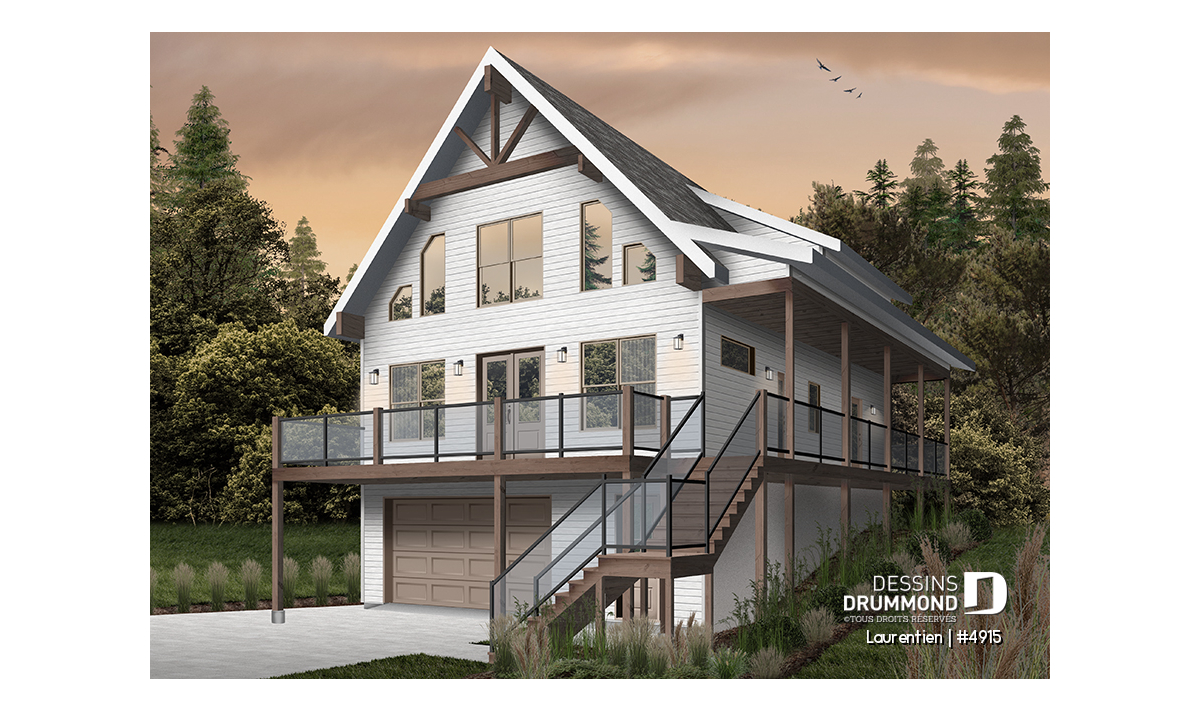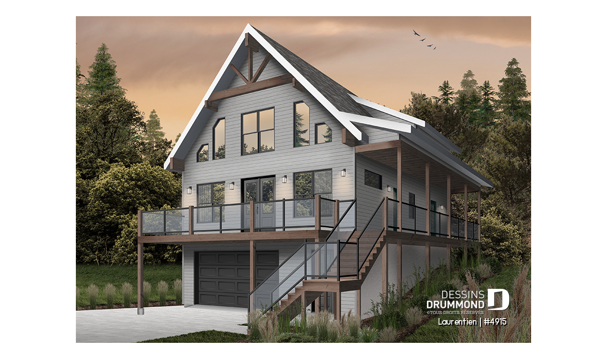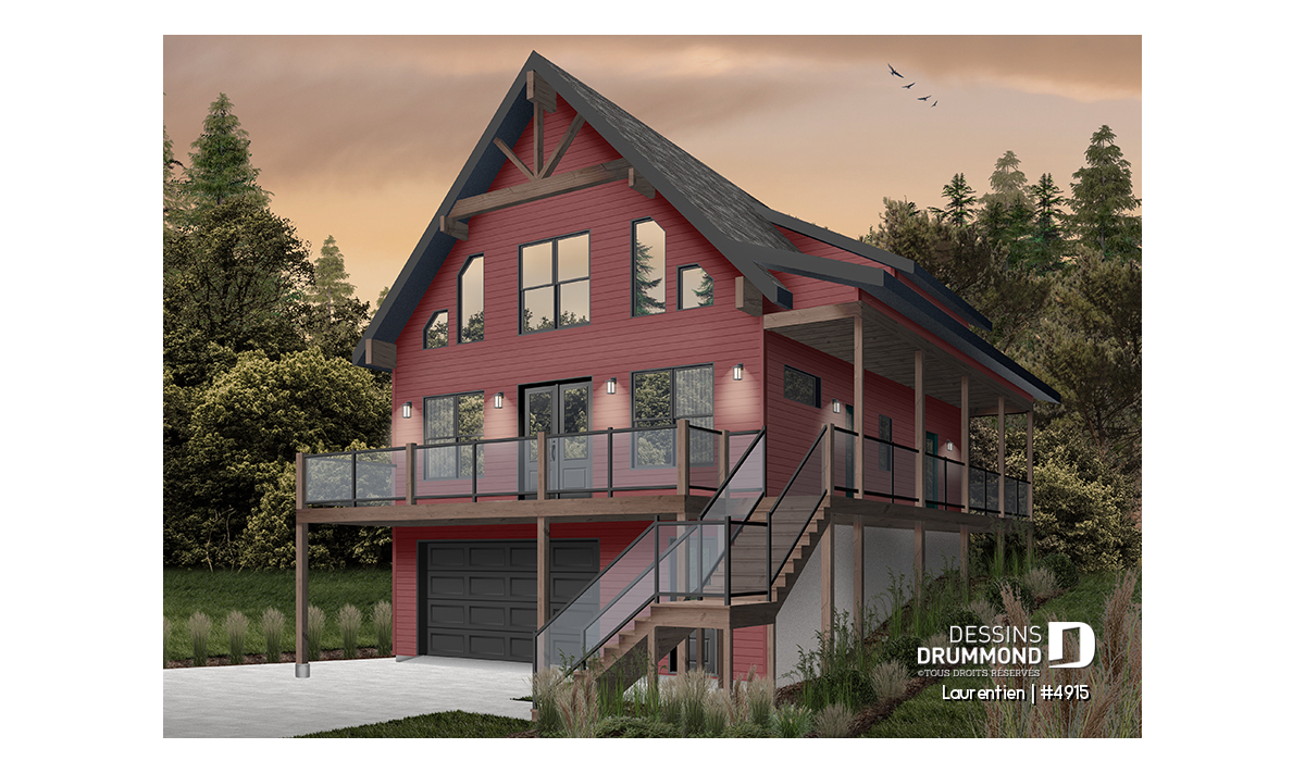 Ce plan de chalet no. 4915 (Laurentien) propose plus de 2055 pieds carrés de surface aménagée. Pratique pour ses 4 chambres à coucher, dont la chambre principale au rez-de-chaussée, il inclut aussi un grand espace à aménager en salle familiale ou en chambre loft (#5) au besoin à l'étage.