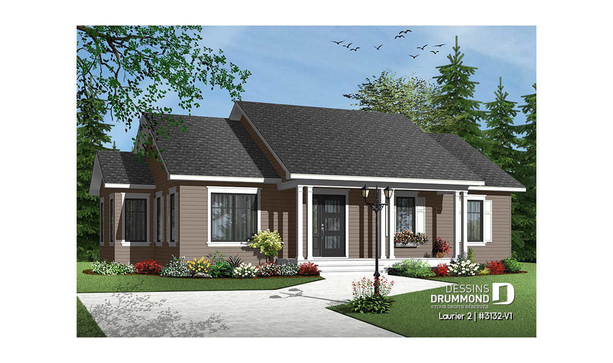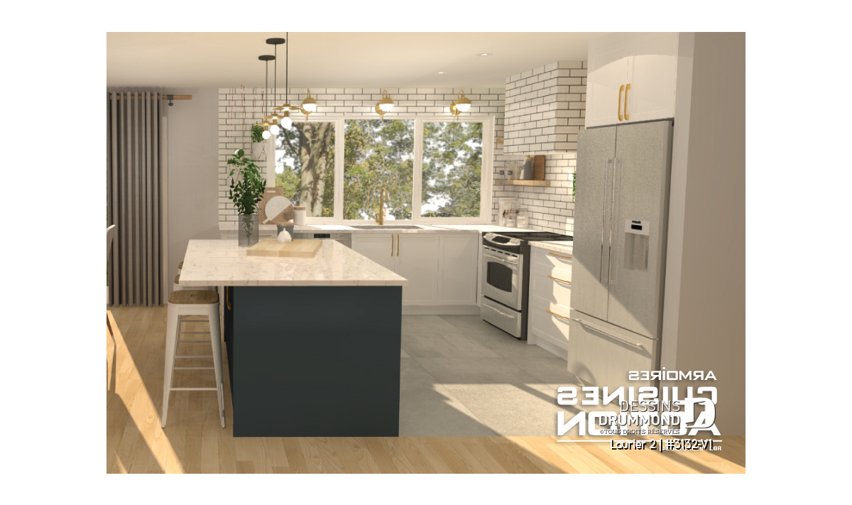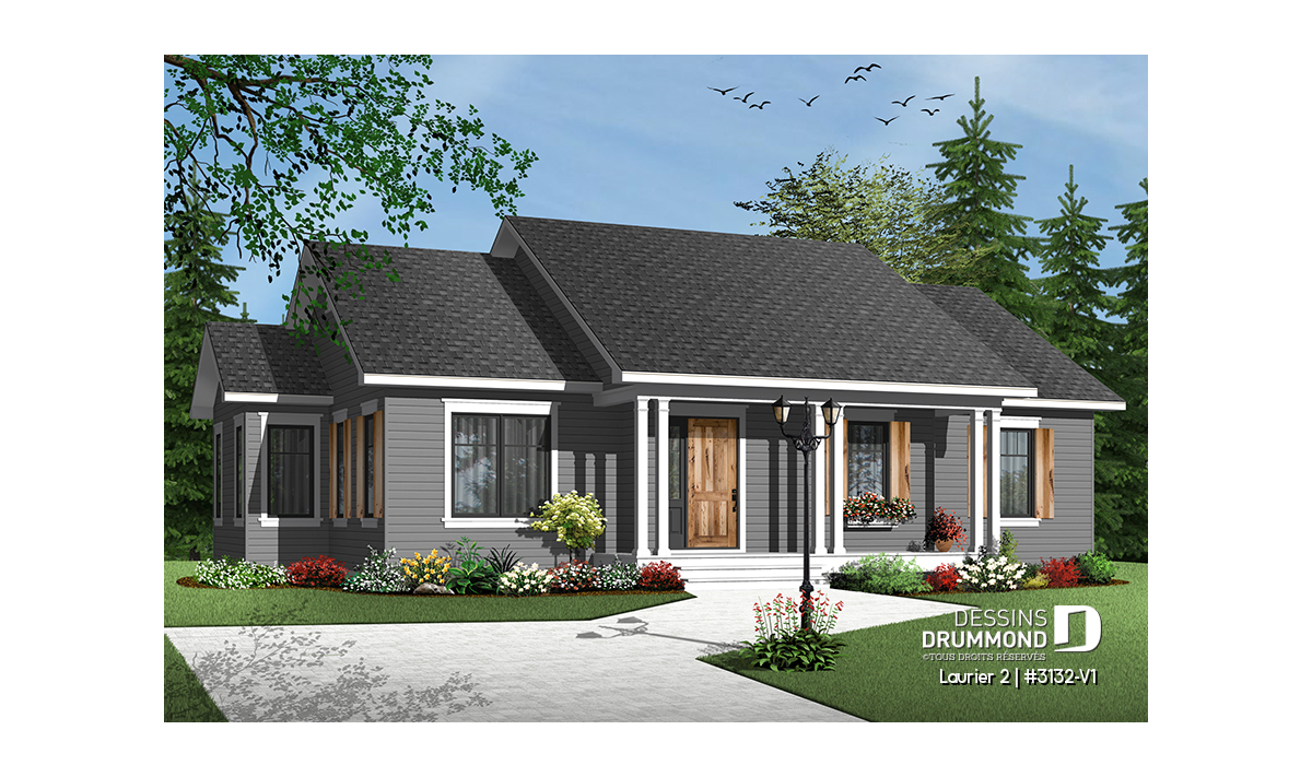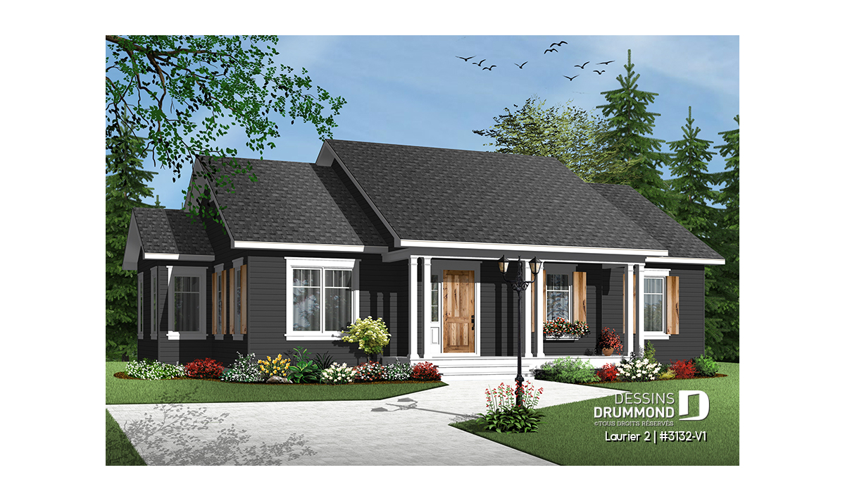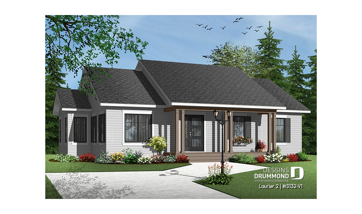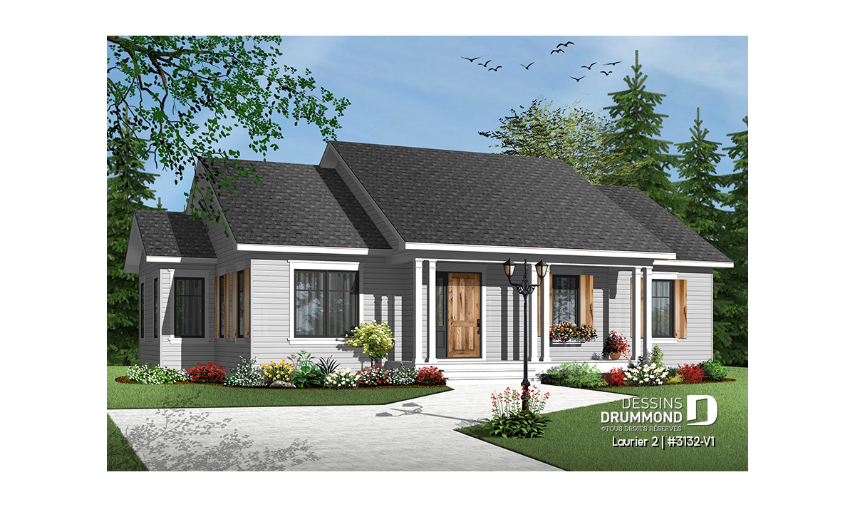 Plan de bungalow champêtre 3 chambres, cuisine attrayante, aire ouverte, salle de lavage au premier