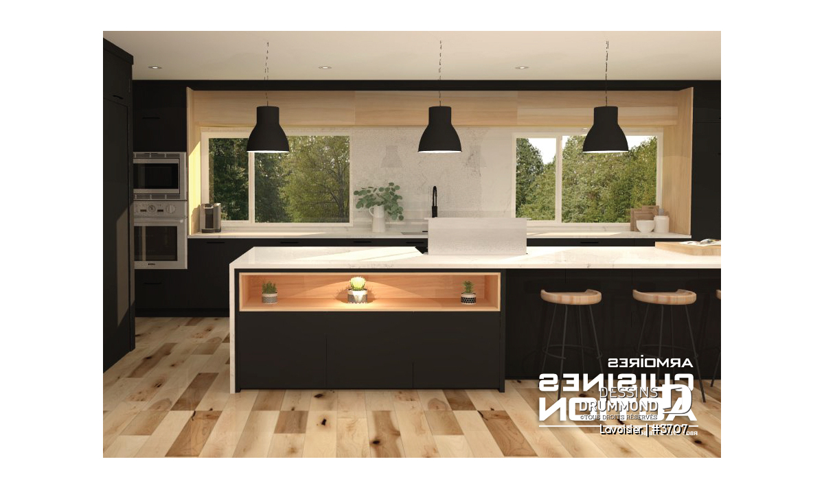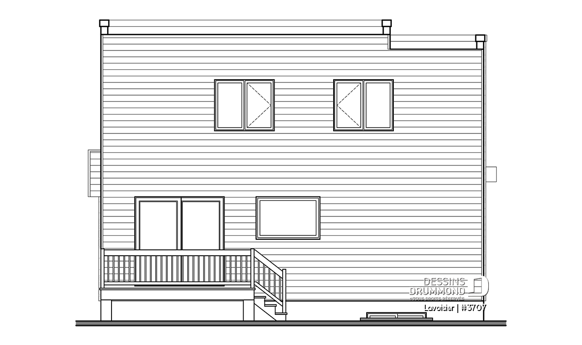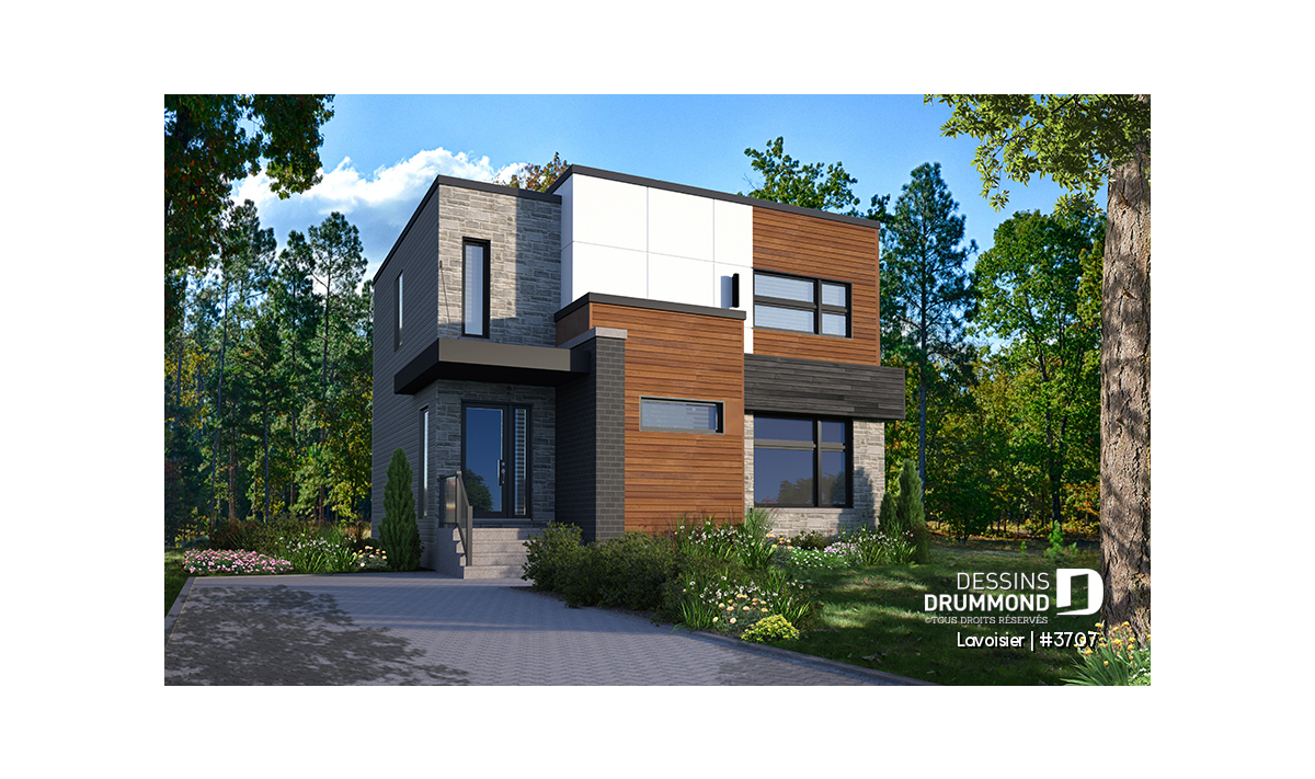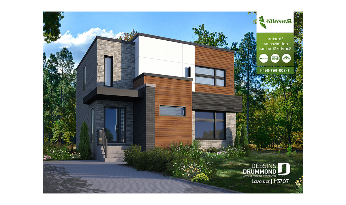 Le plan de maison moderne de style cubique # 3707 de Dessins Drummond (aussi nommé Lavoisier) a été conçu par notre agence Dessins Drummond de Lévis. Ce modèle contemporain à étage comporte un total de 1680 pieds carrés aménagés, un sous-sol à aménager éventuellement et propose trois chambres à l’étage.