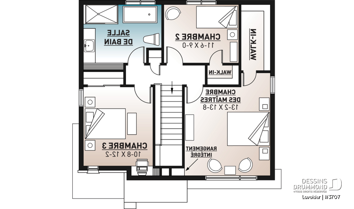 À l’étage, la chambre des maîtres est de grand format et peut facilement loger un lit de format king et des meubles d’appoint. De plus elle possède une grande garde-robe de type walk-in. L’une des chambre secondaire offre aussi un walk-in et l’autre chambre a un bureau de travail intégré. Une lingerie est localisée près de la grande salle de bain familiale. Cette dernière offre une grand douche et un bain séparés.