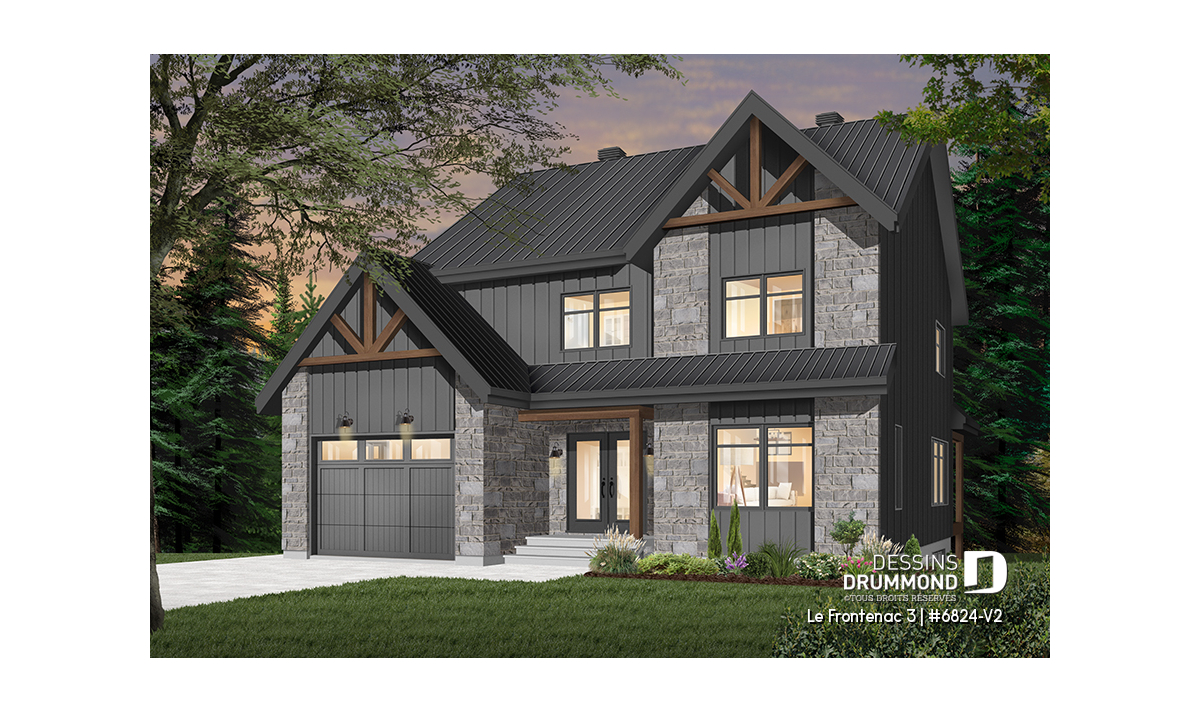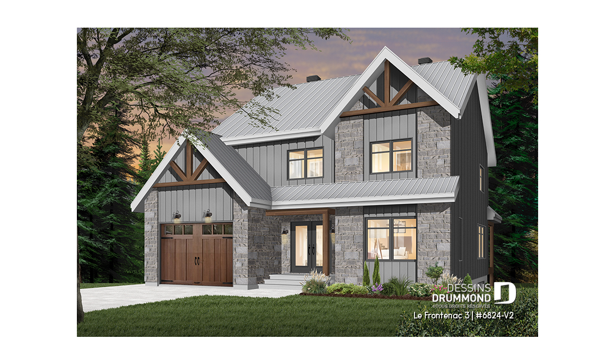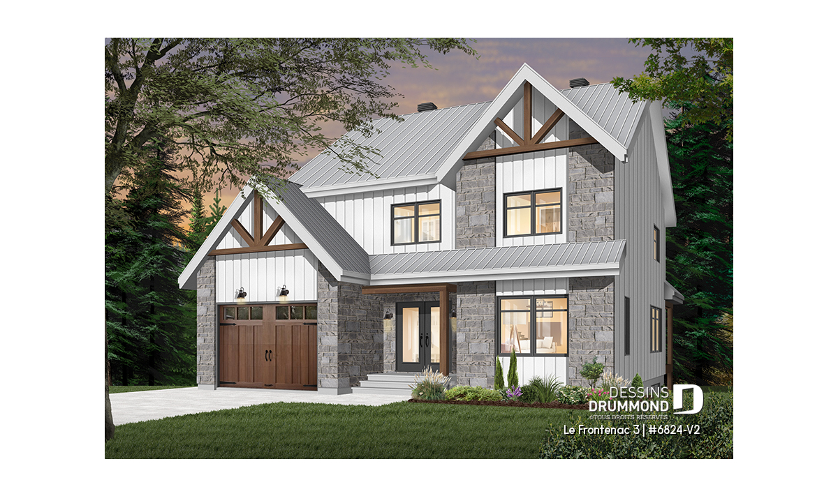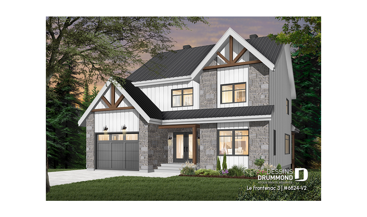 Plan de maison de style tendance champêtre rustique, à étage avec garage et offrant de grandes chambres.