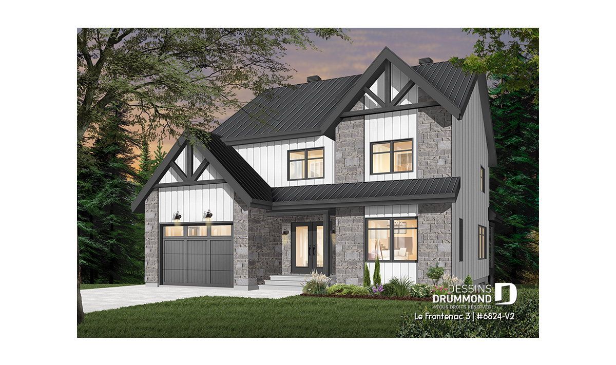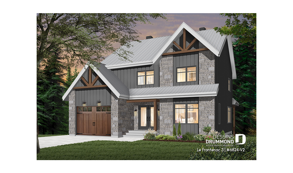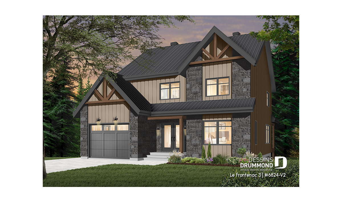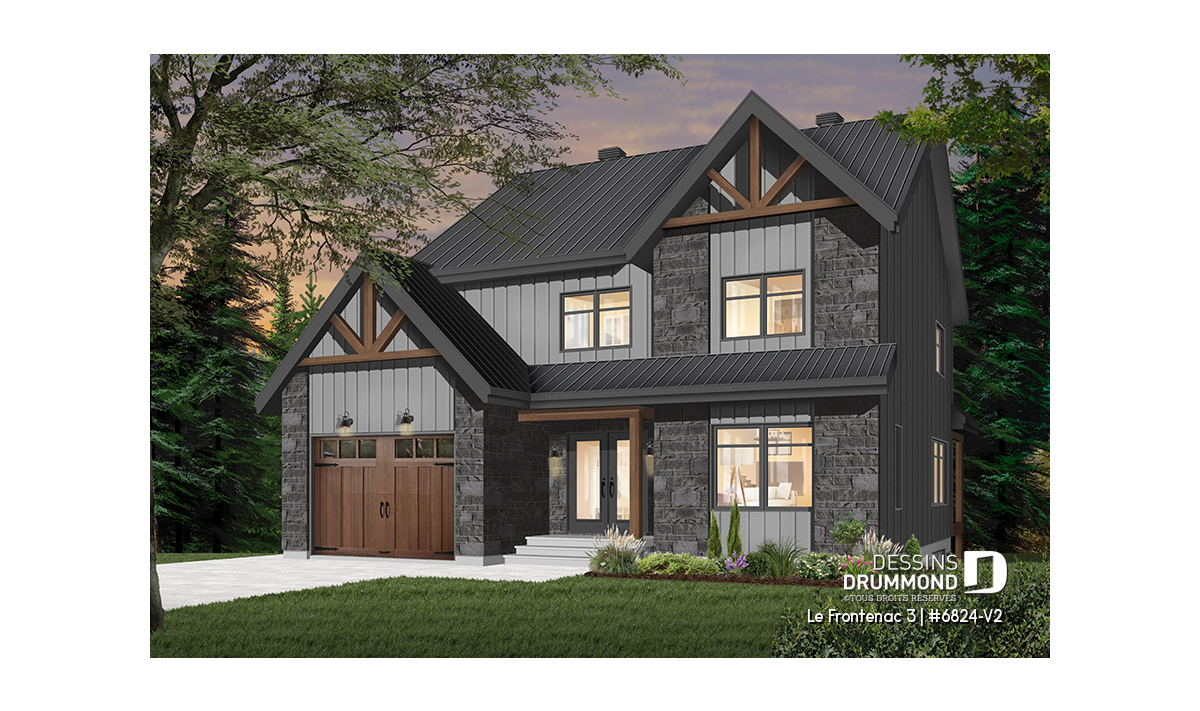 Plan de maison de style tendance champêtre rustique, à étage avec garage et offrant de grandes chambres.